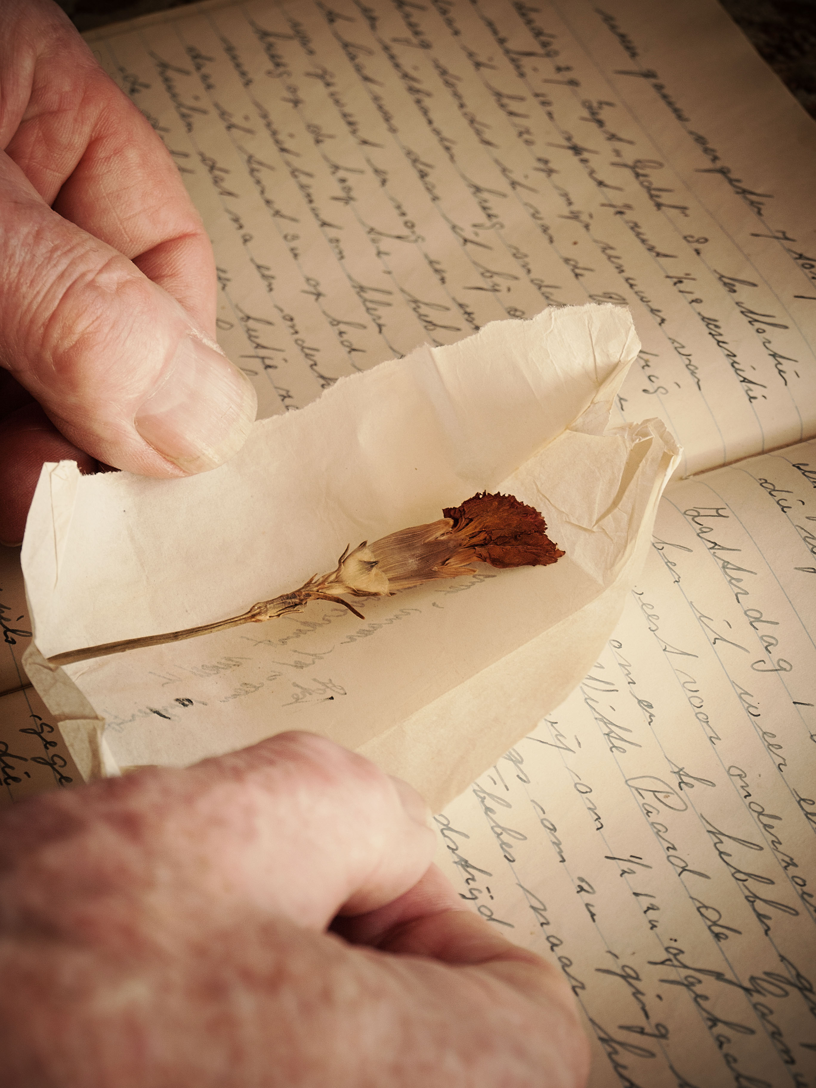 Mijn oma stuurde dit gedroogde anjertje naar mijn opa tijdens de oorlog. Eronder is het dagboek van mijn opa te zien dat hij toen bij hield.