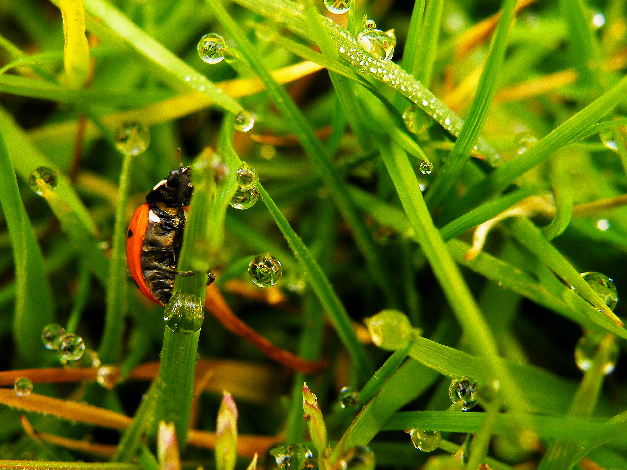 Lieveheersbeestje tussen de dauwdrupjes.