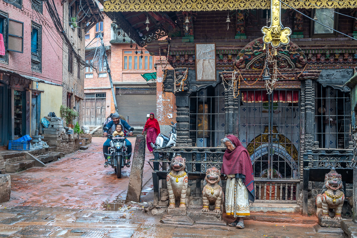 Een straatfoto gemaakt in de straten van Bhaktapur, Nepal. Een hindu tempel versierd met relikwieën met mensen in verschillende levensfasen en het plezier van het kindje op de motor.