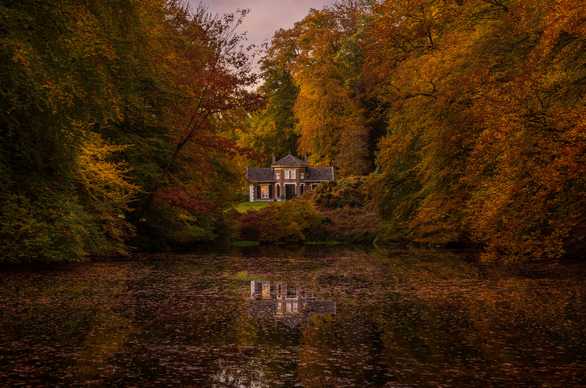 Deze villa ligt mooi verscholen tussen de bomen, nu mooi met herfstkleuren.