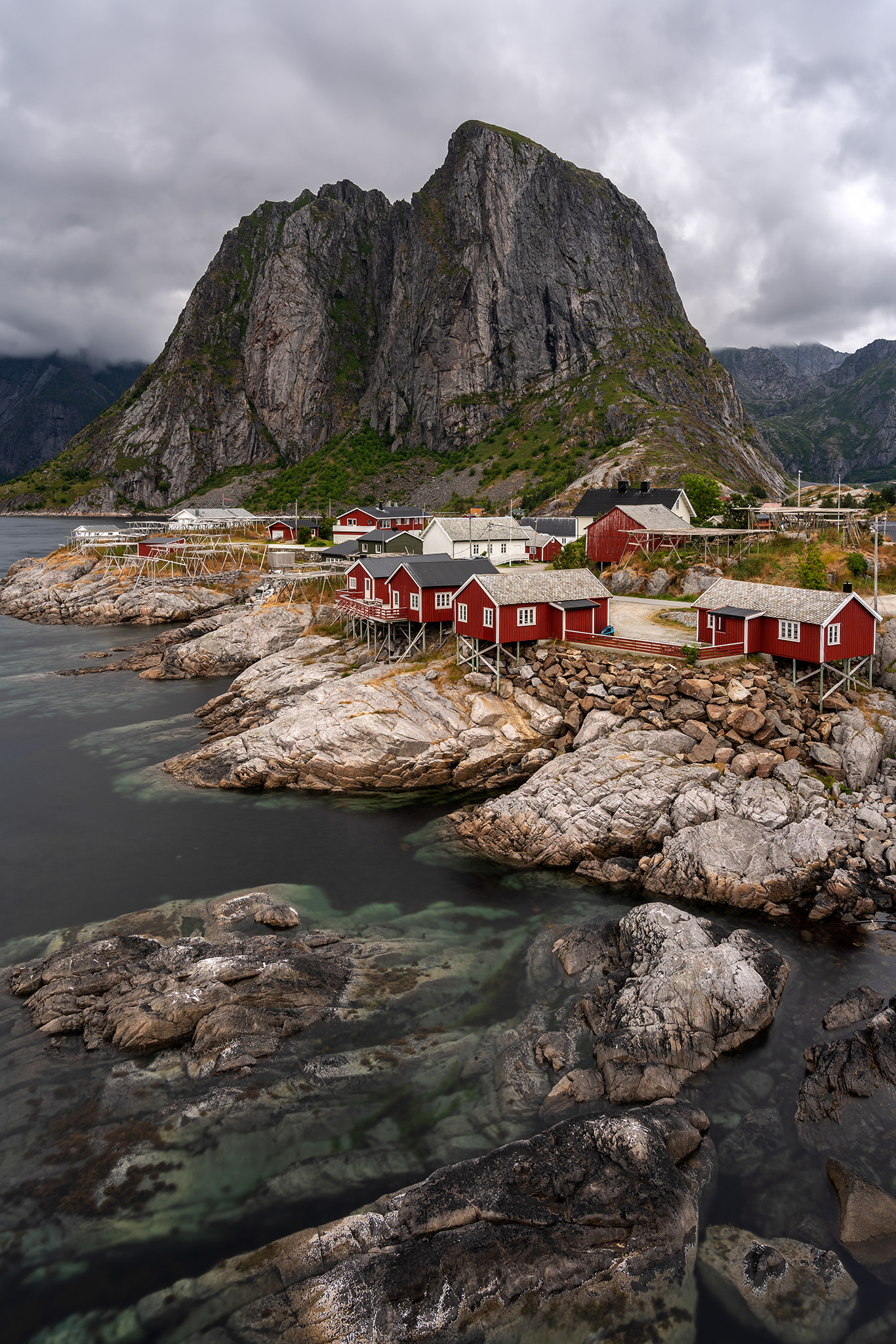 Lofoten staat bekend om zijn uit de zee reizende bergen en rode huisjes op palen, wat deze foto goed weergeeft.