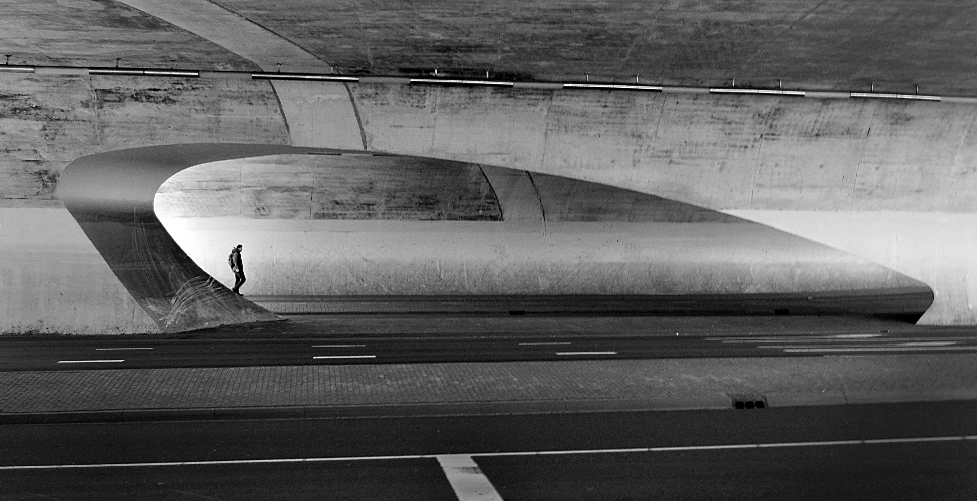 Een persoon eenzaam lopend onder een brug te Arnhem.