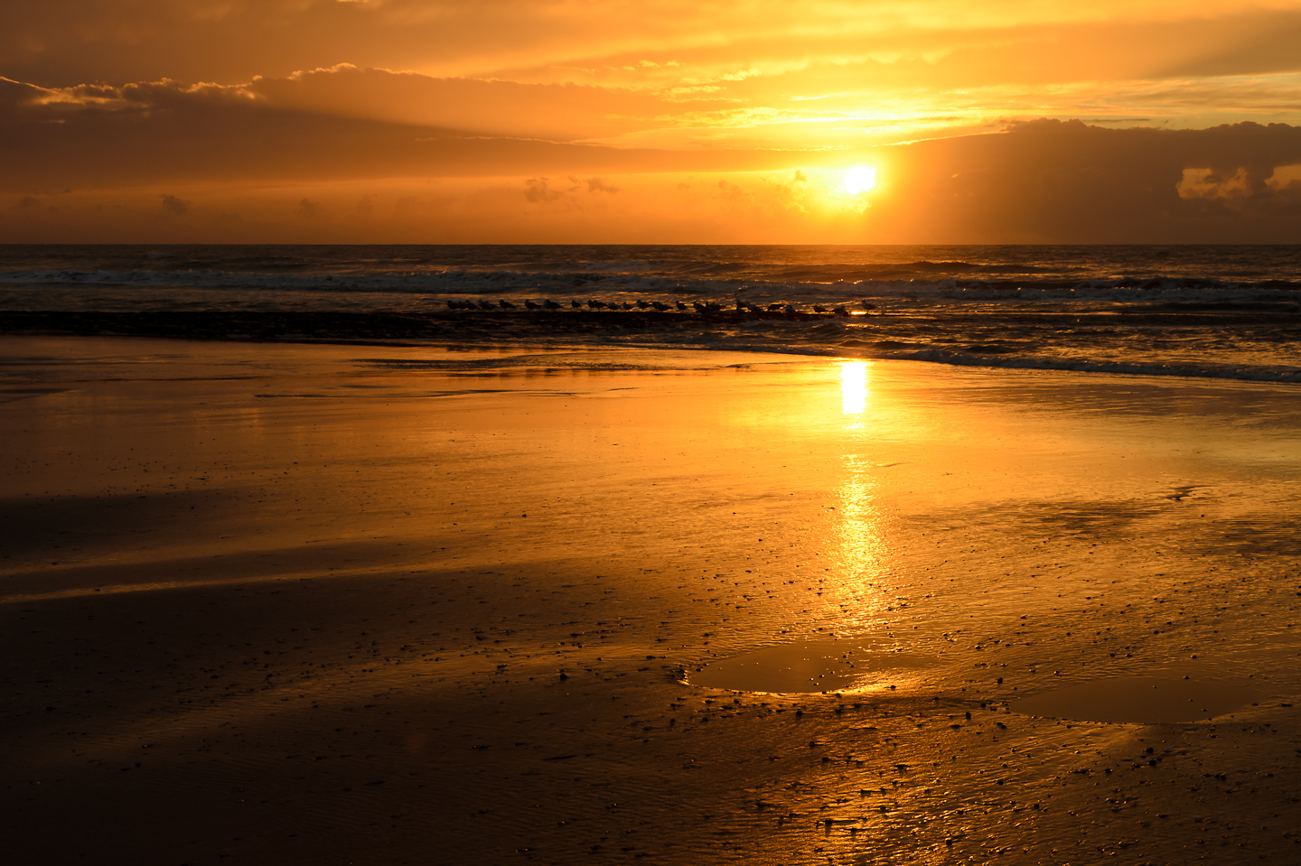 Zonsondergang op een eenzaam strand. Alleen de meeuwen kijken mee.