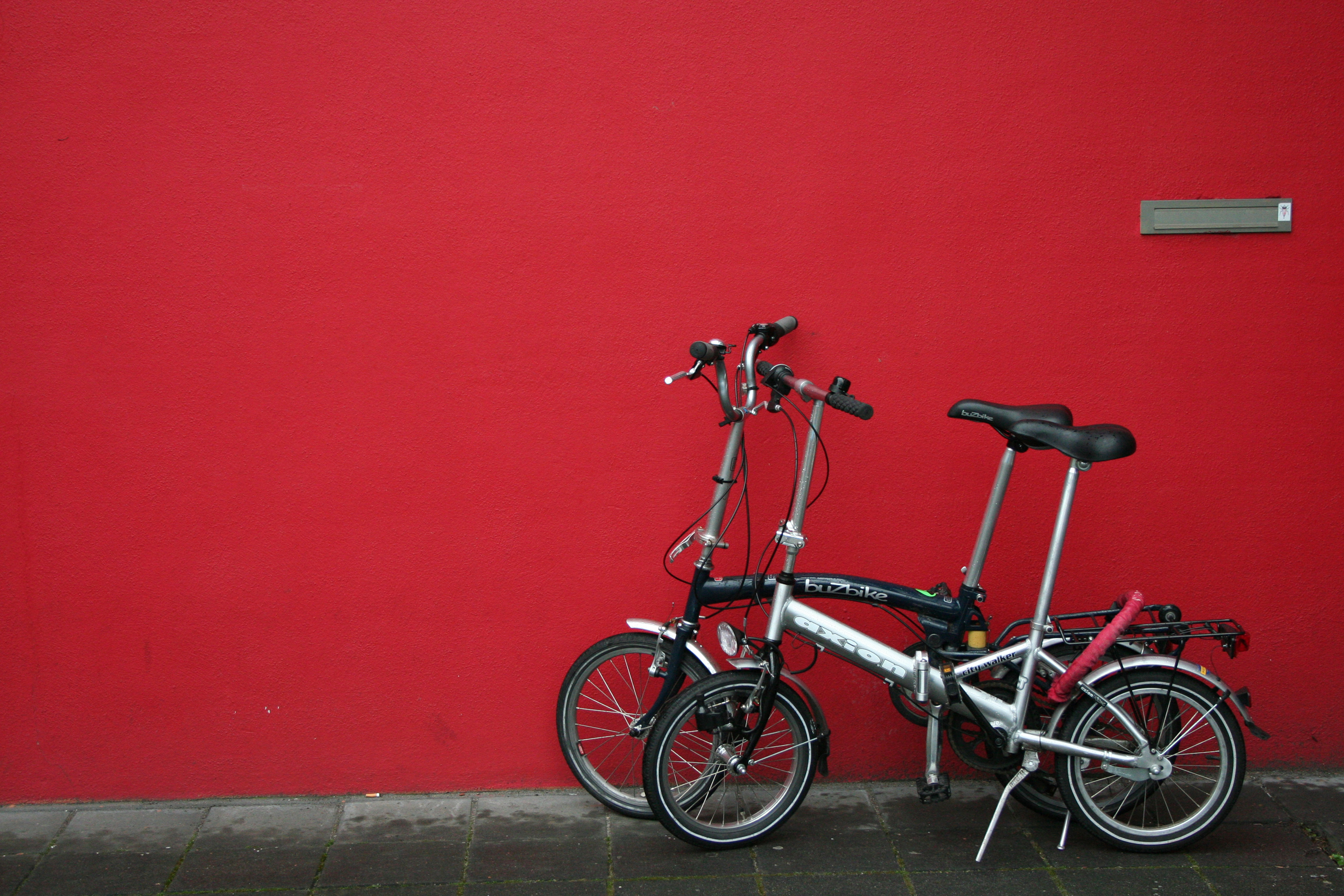 Twee vouwfietsen innig samen voor een rode muur, Utrecht, Nederland