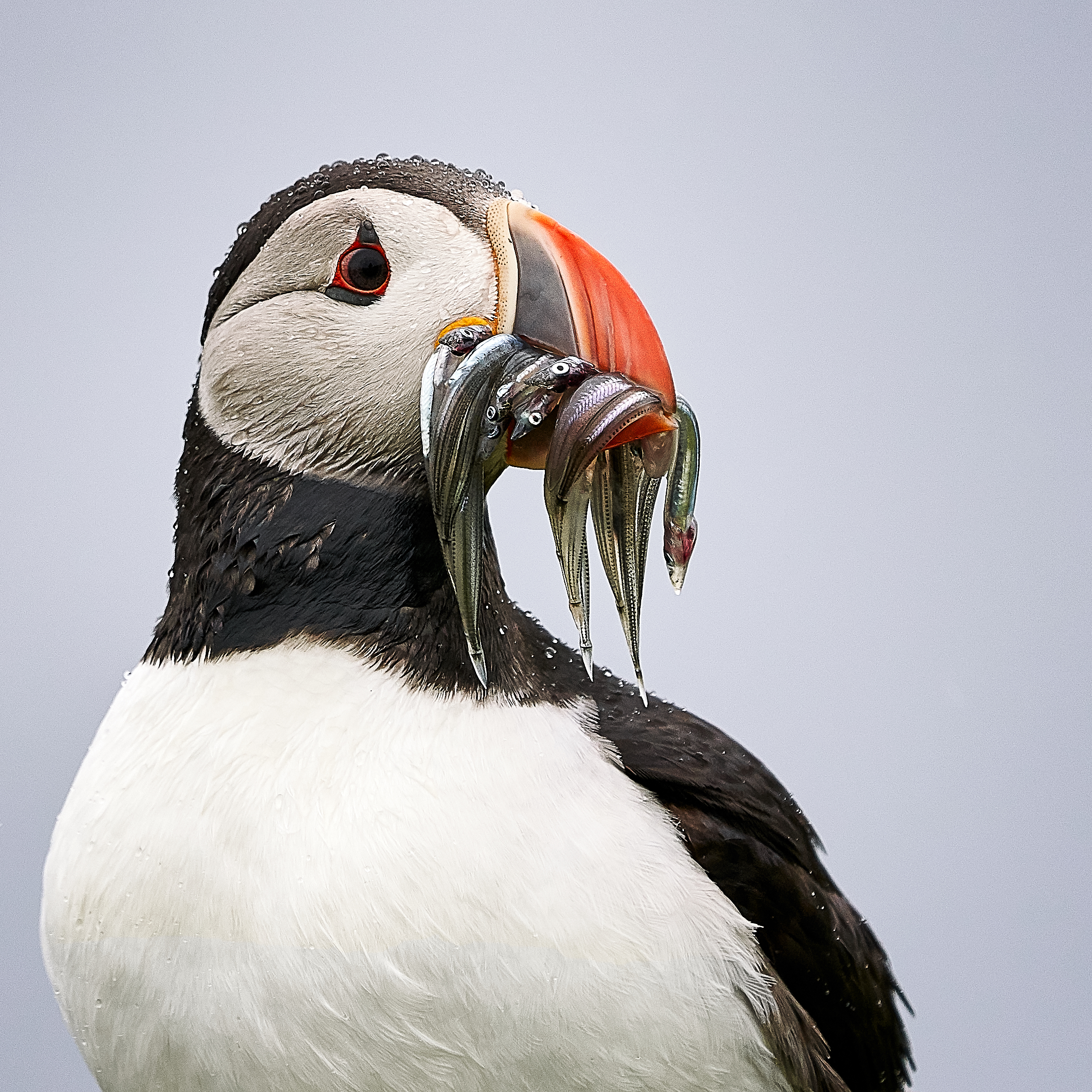 Een papagaaiduiker, met visjes in z'n/haar bek, om de kleintjes in het nest te voeden.