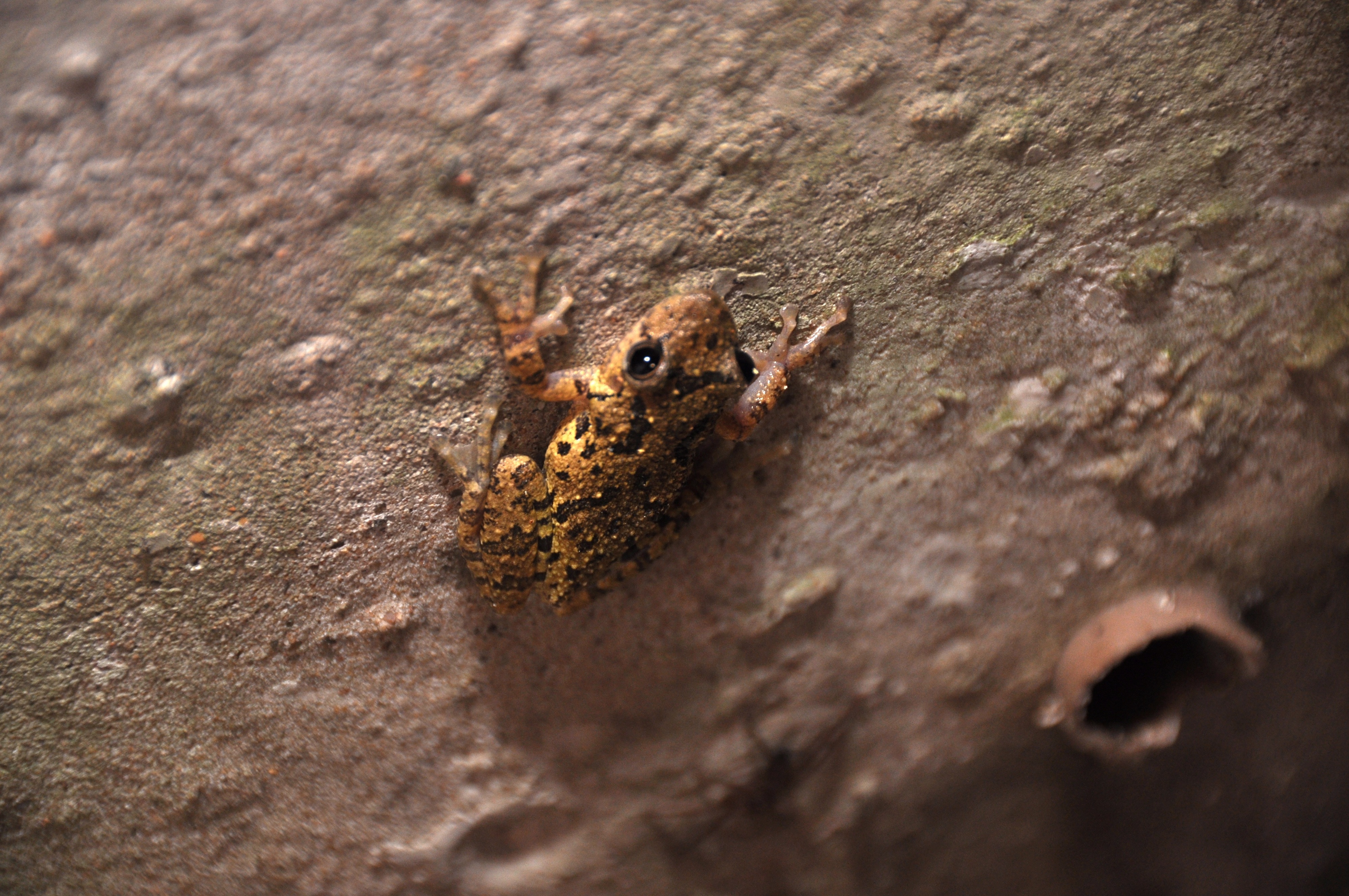Dit mini-kikkertje zat op de wand van een fontein. Van dichtbij is het net of ie in een maan landschap zit