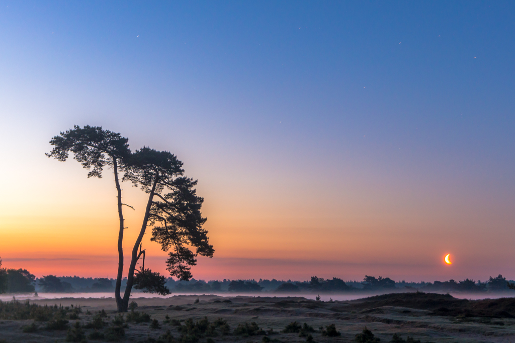 Leuk om te zien, de maansopkomst en de zonsopkomst in 1 foto zondagochtend om 4 uur.