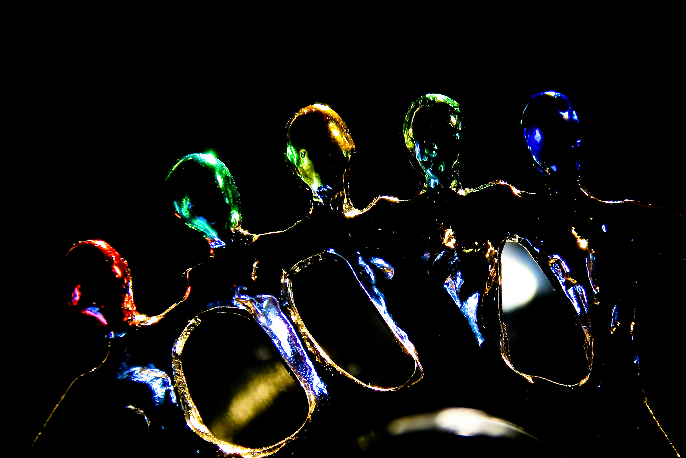 Het betreft een closup van een wijnfleshouder. Met open lens van verschillende kanten belicht met zaklamp.