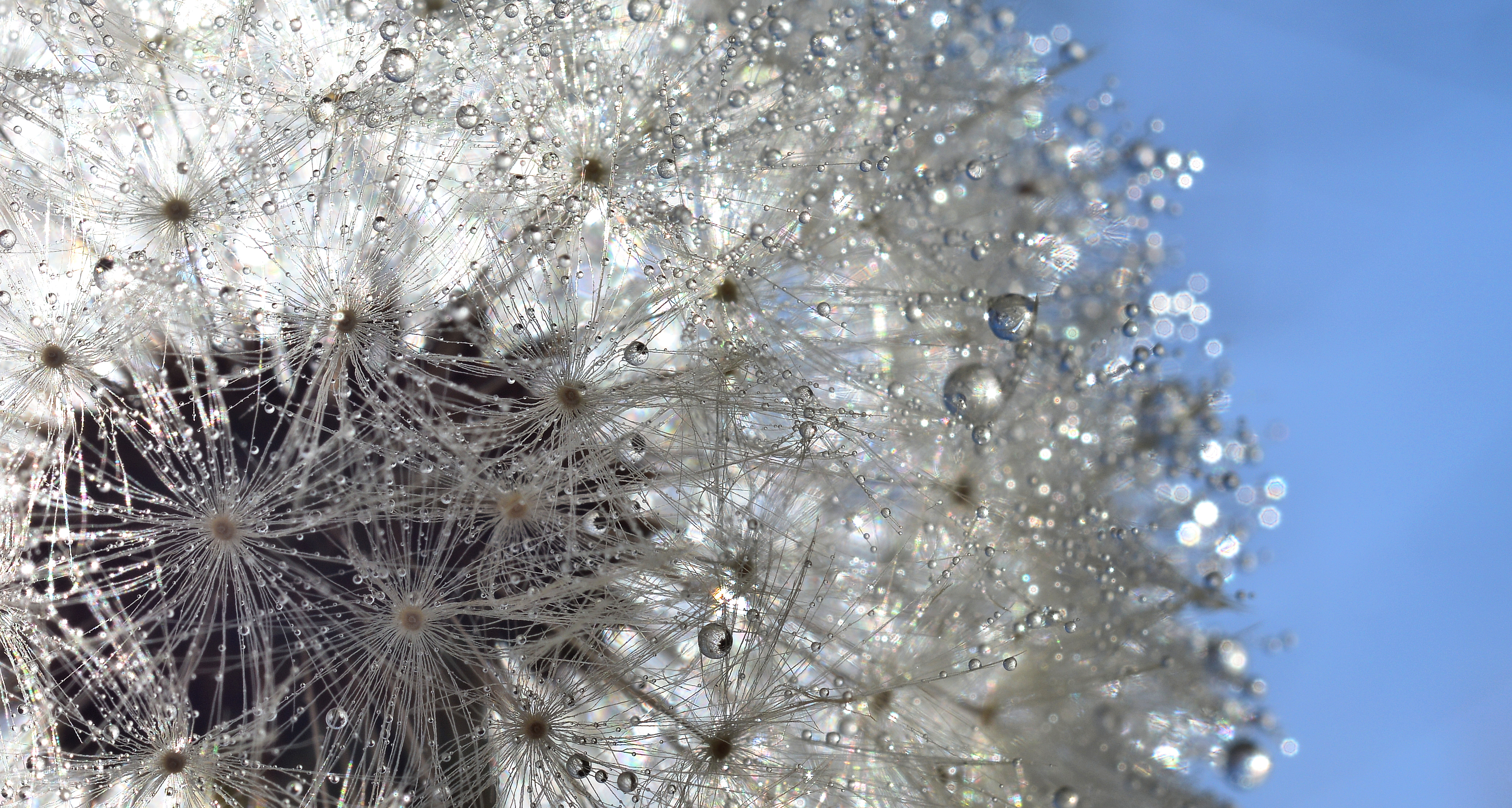 druppels op een uitgebloeide paardenbloem met als achtergrond een blauw lucht.