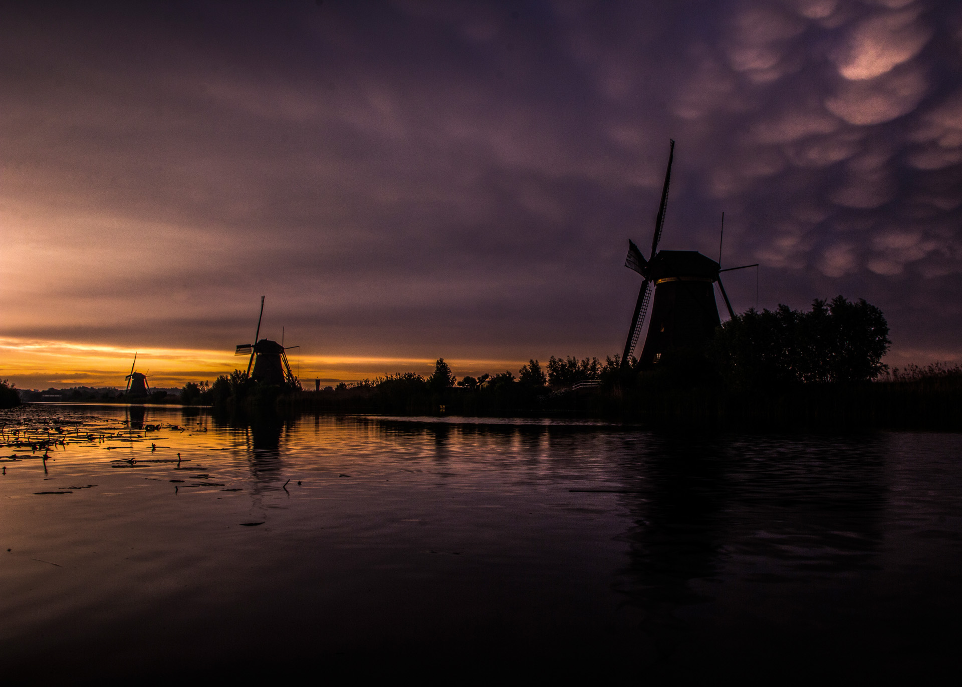 Mammatus over Kinderdijk bij zonsondergang