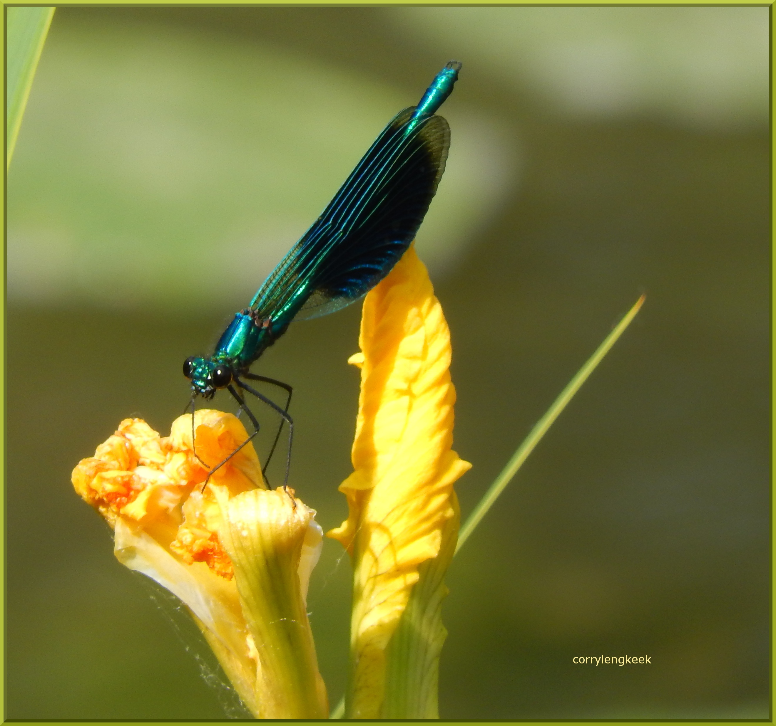man weidebeeklibelle op bloem van gele lis