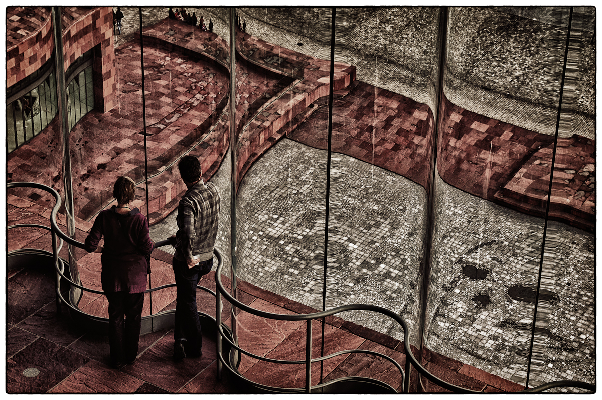 Het perspectief was me meteen opgevallen en ik heb gewacht met afdrukken tot er zich personen zouden aandienen om als voorgrond te fungeren. Toen dit koppel nietsvermoedend plaatsnam voor mijn lens kon mijn geluk niet op. Let maar op de trui van de man die een soortgelijk patroon heeft als de tegels buiten en de kleur van de vrouw haar kleding sluit mooi aan bij de steenkleur van het MAS.