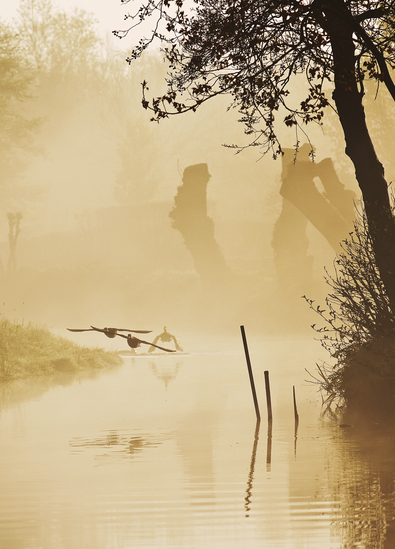 ongeveer tien seconde voor dit moment dat een eend achter twee meerkoeten aanvliegt was alles nog rustig , ze dobberden heerlijk rustig rond , maar ja in het voorjaar zijn we allemaal nogal opvliegerig