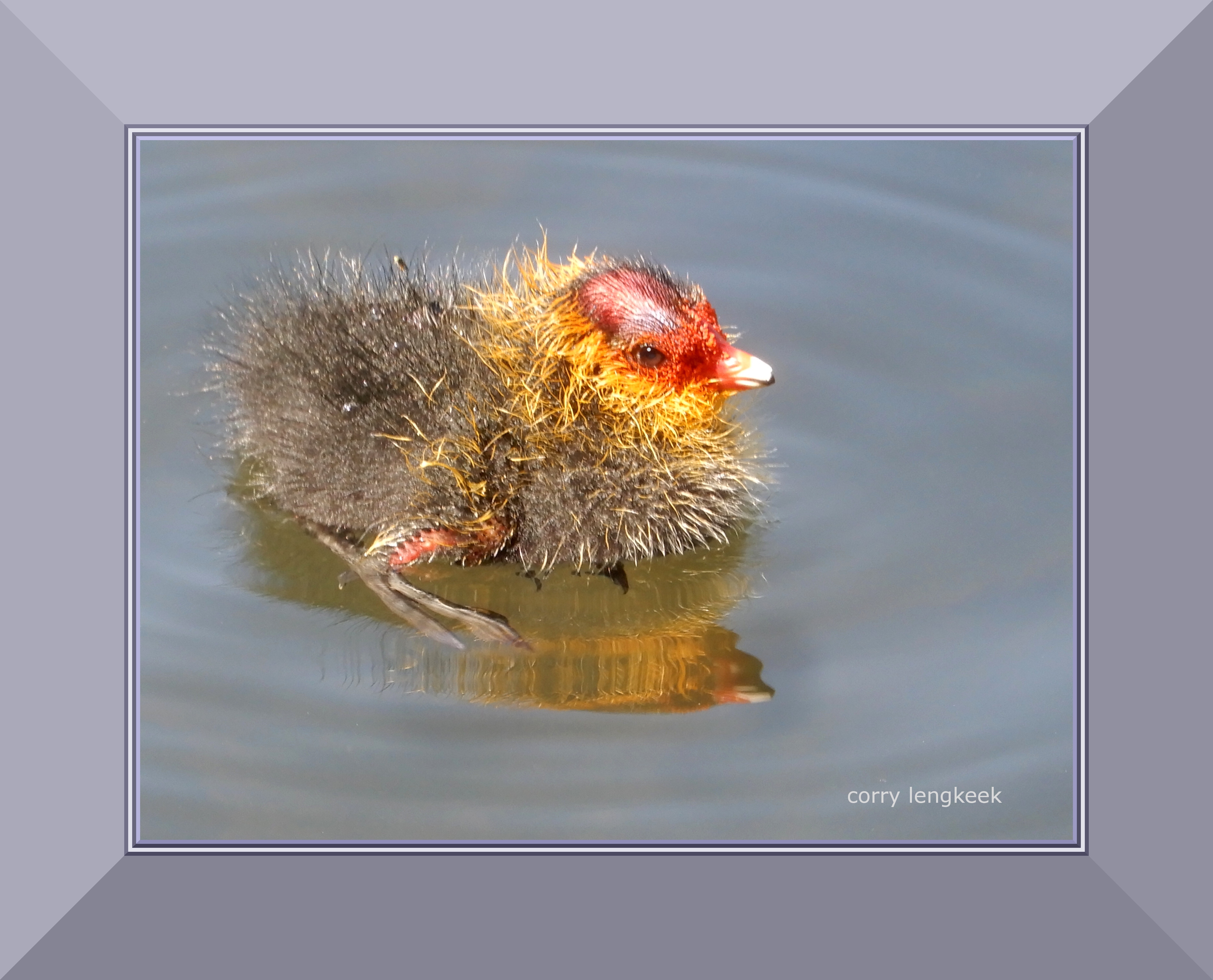 Meerkoetkuiken zwemmend in vijver Wilheminapark Utrecht.