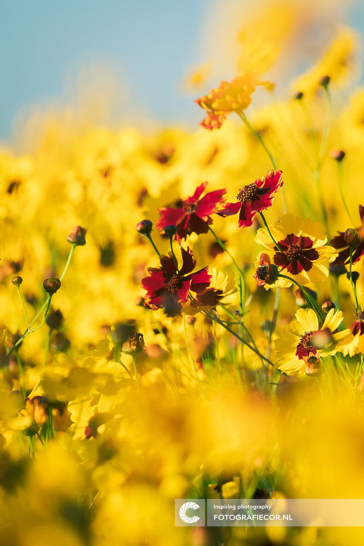 Contrasten, we zien ze overal maar lopen er te vaak aan voorbij of het dringt niet binnen wat we zien waneer we ernaar staan te kijken. Een beeld van een prachtig veld met kweekbloemen op het vlakke landschap van Zeeland tok mijn aandacht. Het geel wuifde in de harde zeewind vanaf de kust en schitterde in de zomerzon to ik opeens deze prachtige rode versie van het bloemetje met de meisjesogen zag afsteken tegen de achtergond.