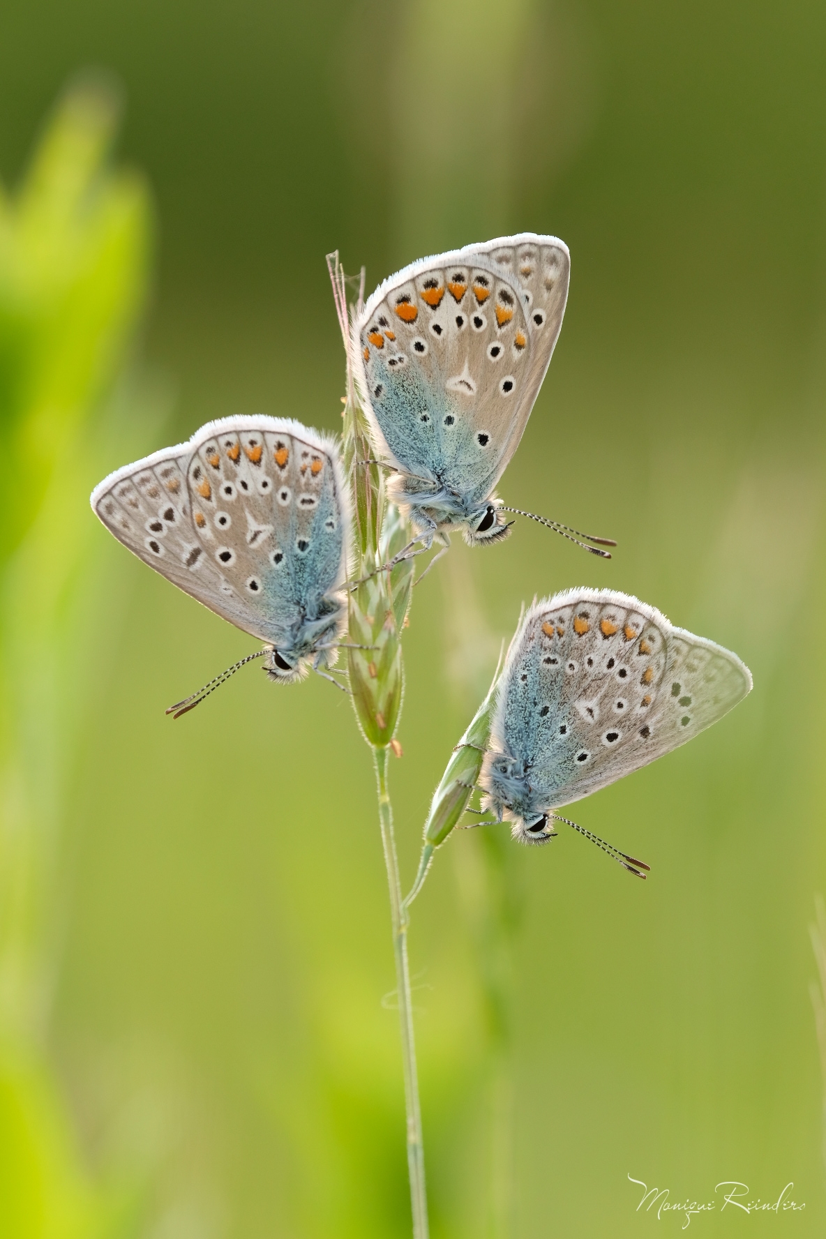 Deze drie Icarusblauwtjes zaten prachtig bij elkaar. Icarusblauwtjes brengen de nacht in groepjes door. Gelukkig was er die avond bijna geen wind wat het fotograferen wat makkelijker maakte.