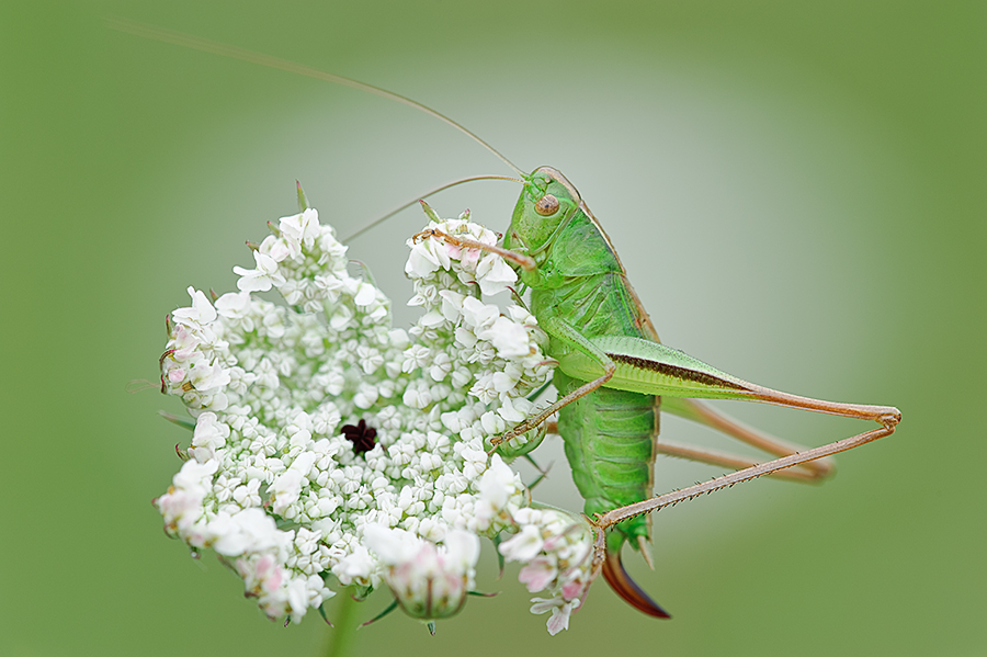 Het vrouwtje van de sabelsprinkhaan zat op wilde peen. De kleur van deze bloem komt ook als een witte vlek terug in de achtergrond. Je kan zien dat het een vrouwtje is aan de legboor.