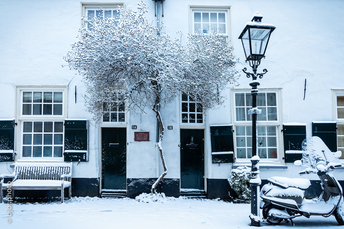 De voormalige armenwoningen aan de Springweg in Utrecht onder een prachtig sneeuwdek.