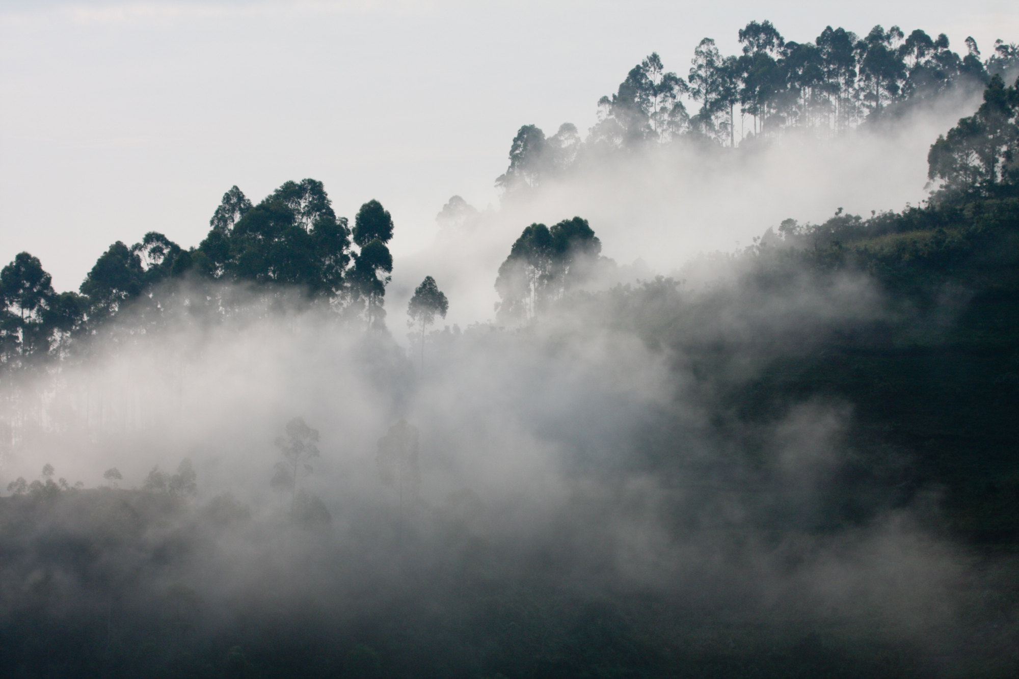 Een mistige ochtend in de bergen van Oeganda.