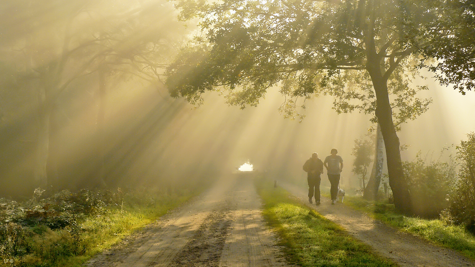 Twee joggers in het gouden ochtendlicht.