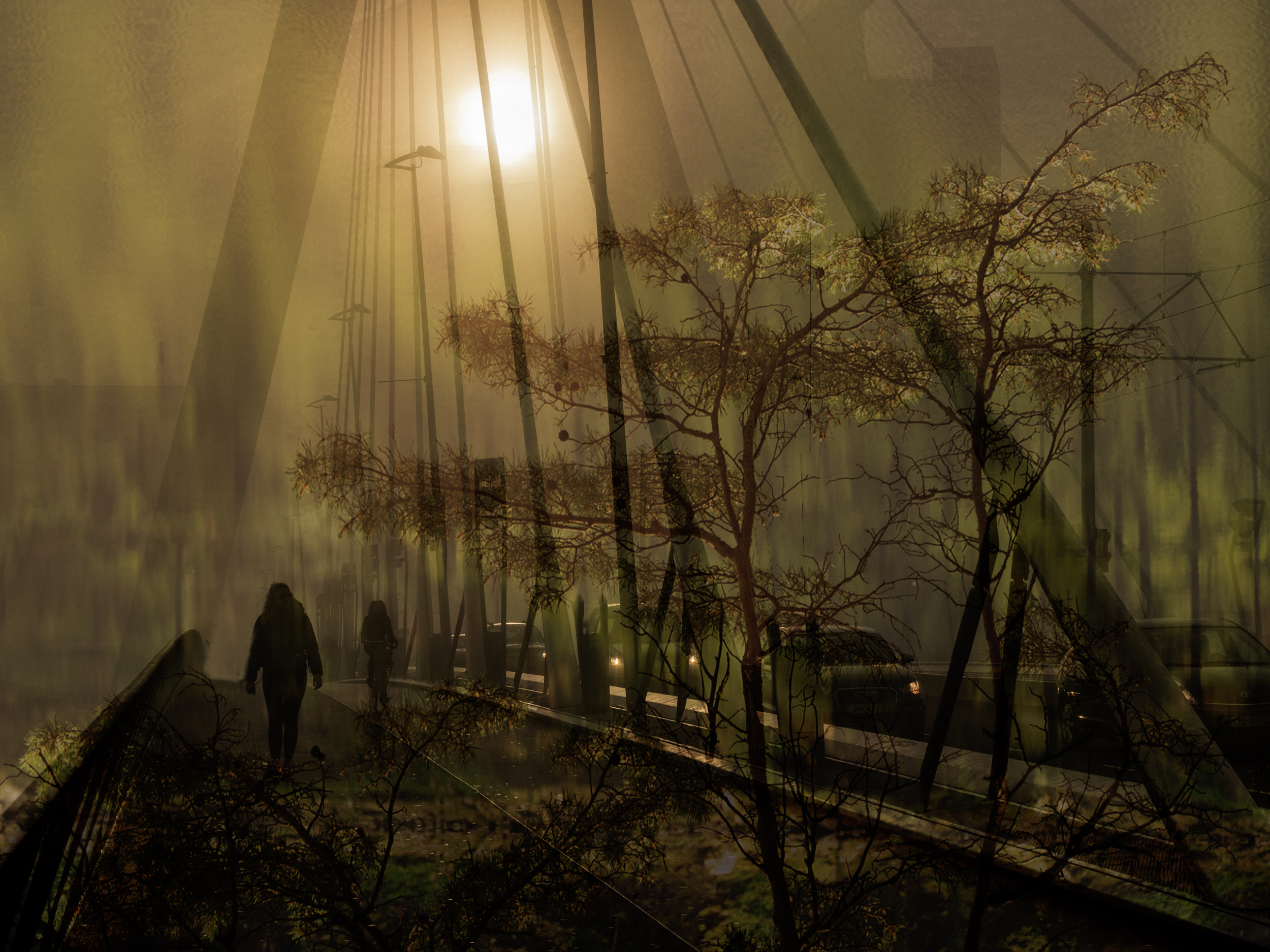 Een mistige Erasmusbrug gecombineerd met een natuurfoto geeft een mystiek en onaards beeld.