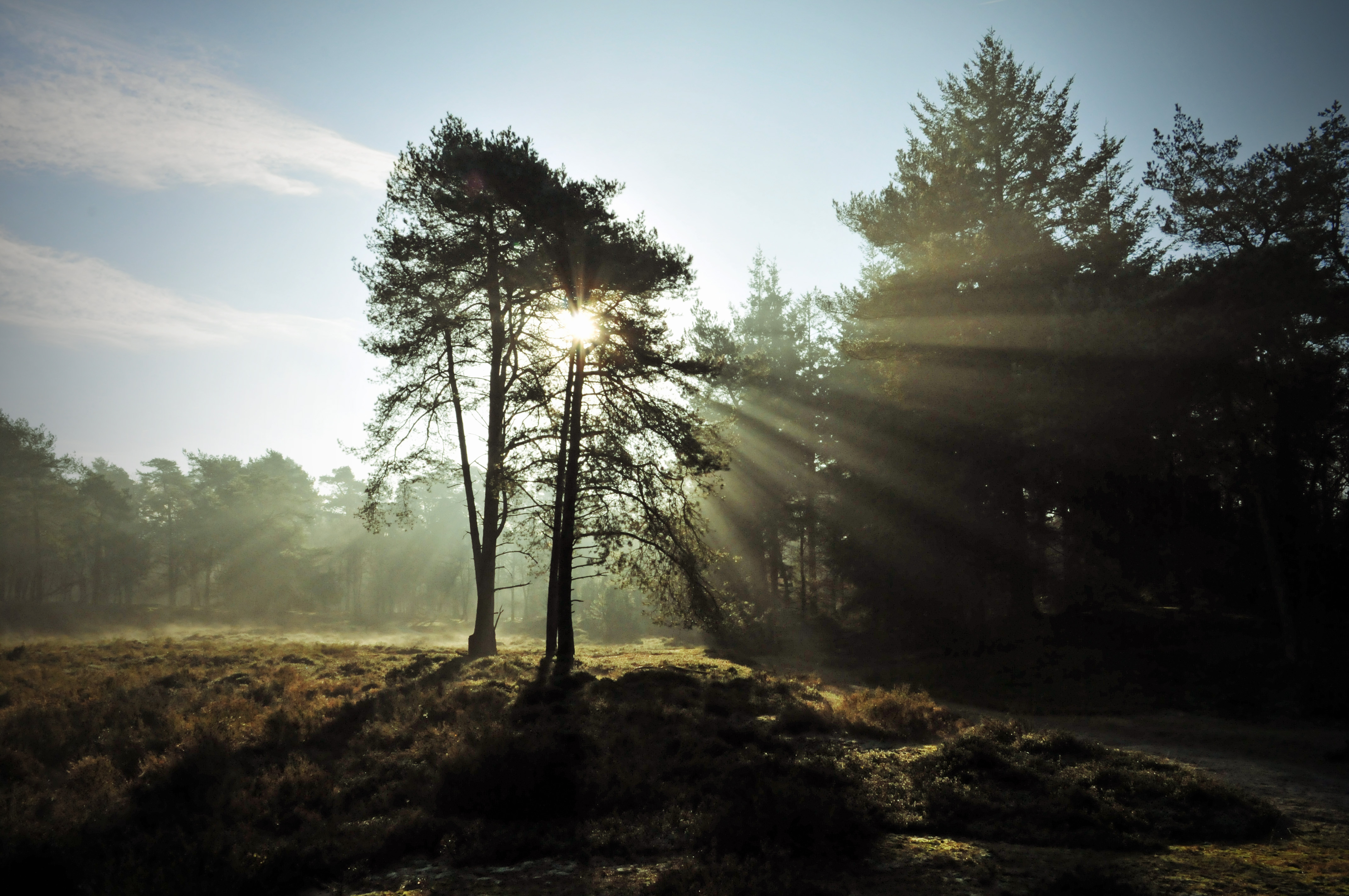 's Morgens vroeg, de rijp ligt nog op de heide en de takken van de bomen.