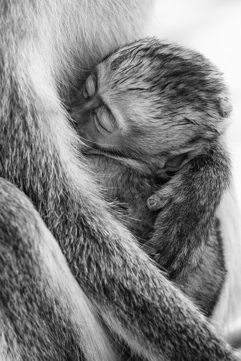 Een heel jong aapje veilig in de armen van moeder