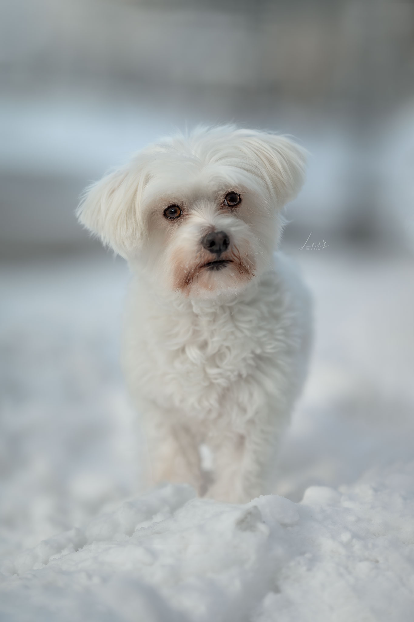 Na heel wat 'zoomies' door de sneeuw nam Moos een pauze om te kijken wat haar baas en ik aan het doen waren.