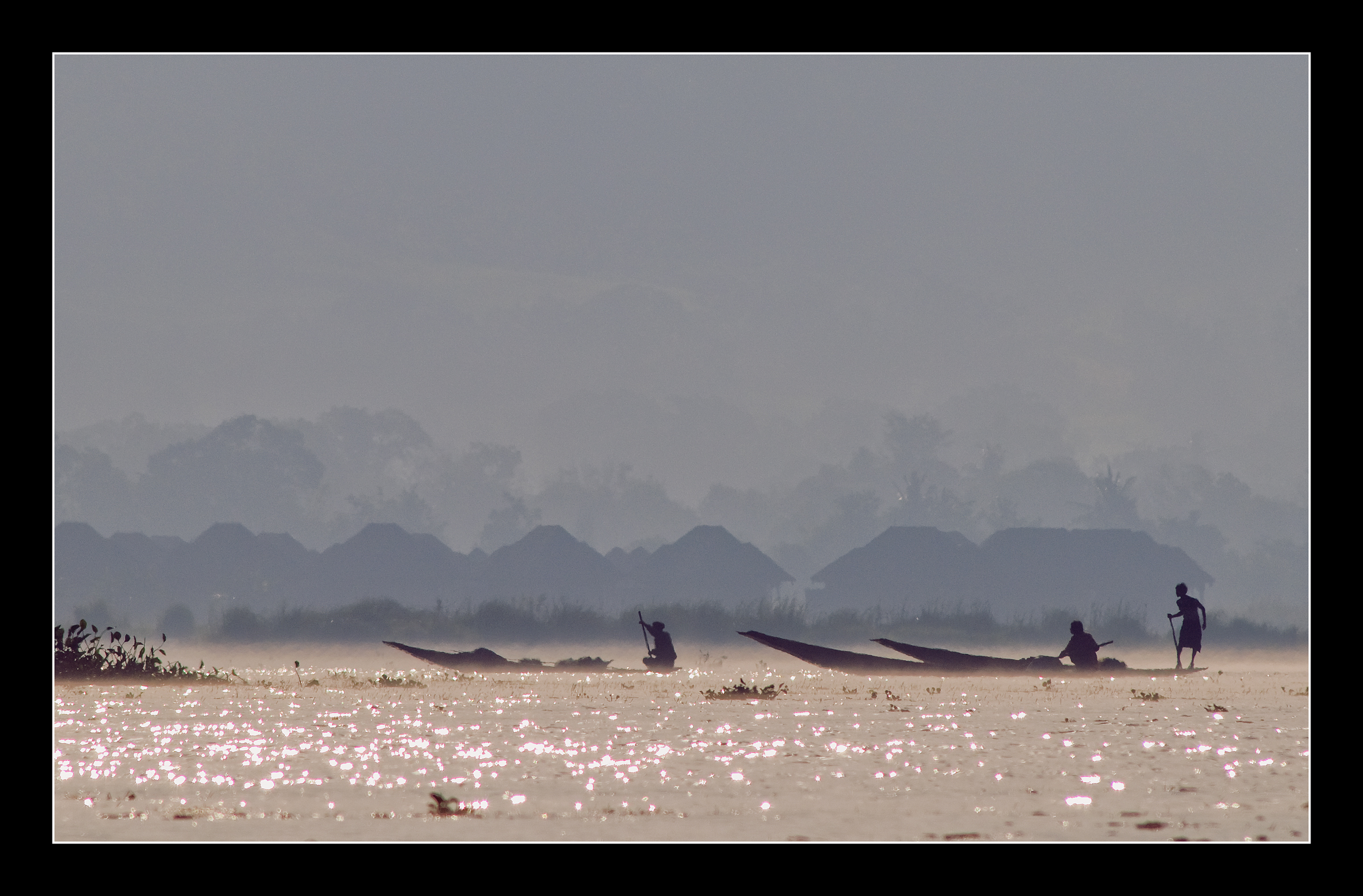 Vissers in het vroege ochtendlicht op het Inle Lake, centraal Myanmar.