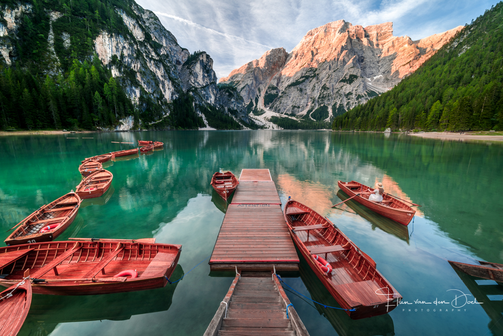 Een prachtige morgen bij het Lago di Braies in de Dolomieten.