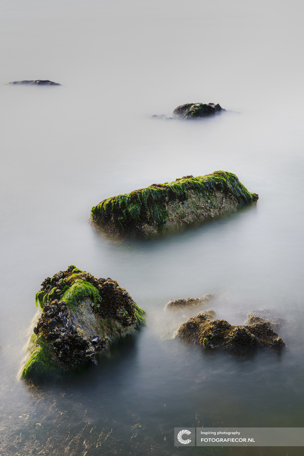 Deze landschapsfoto vangt de serene schoonheid van de kustlijn tijdens de schemering. De met algen begroeide rotsen, gehuld in een mysterieuze mist door de lange sluitertijd, creëren een dromerig en tijdloos tafereel. Het zachte licht en het vloeiende water nodigen uit tot contemplatie en reflectie. Een weergave van de rustgevende kracht in de natuur.