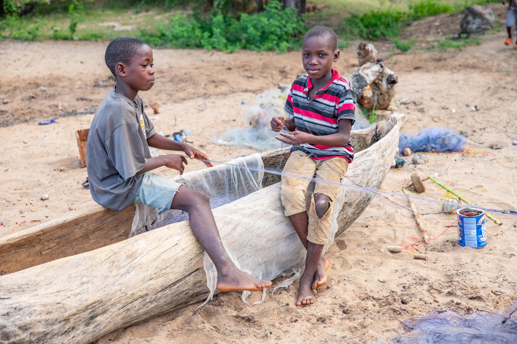 Na het vissen worden de netten gerepareerd in het noorden van Malawi.