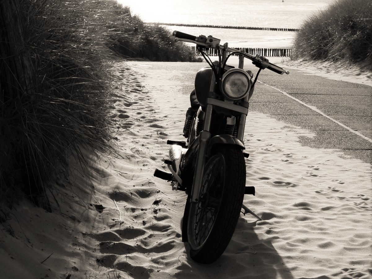 De eigenaar van deze motor had zijn voertuig achtergelaten op een duinpad bij Westkapelle in Zeeland om waarschijnlijk na een warme motorrit nog even een koele duik te nemen.