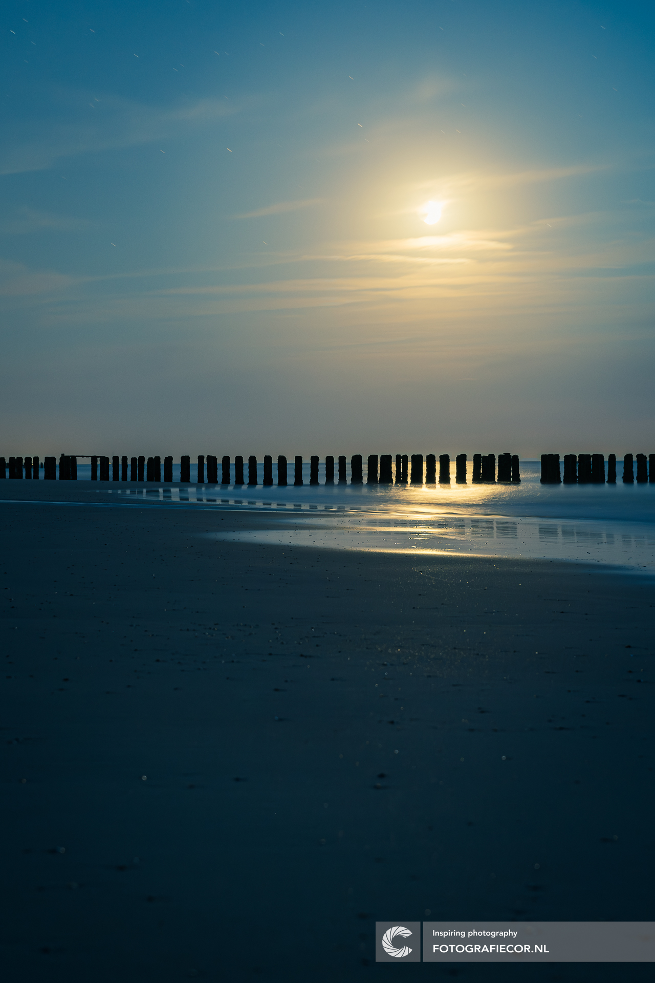 Vaak overdag gefotografeerd of bij zonsondergang maar ook een late avondwandeling heeft zo zijn sfeer. Vaak wat moeilijker te fotograferen maar met een langere sluitertijd komt de rust van de zomerse avond tot zijn recht en geeft het maanlicht een sfeervol lichtspel lichtspel op het wateroppervlak en het natter strand. In de lucht zie je de sporen van de sterren door de draaiende aarde terwijl in de voorgrond kleine lichtpuntjes te zien zijn van de kleine steentjes die oplichten door het maanlicht.