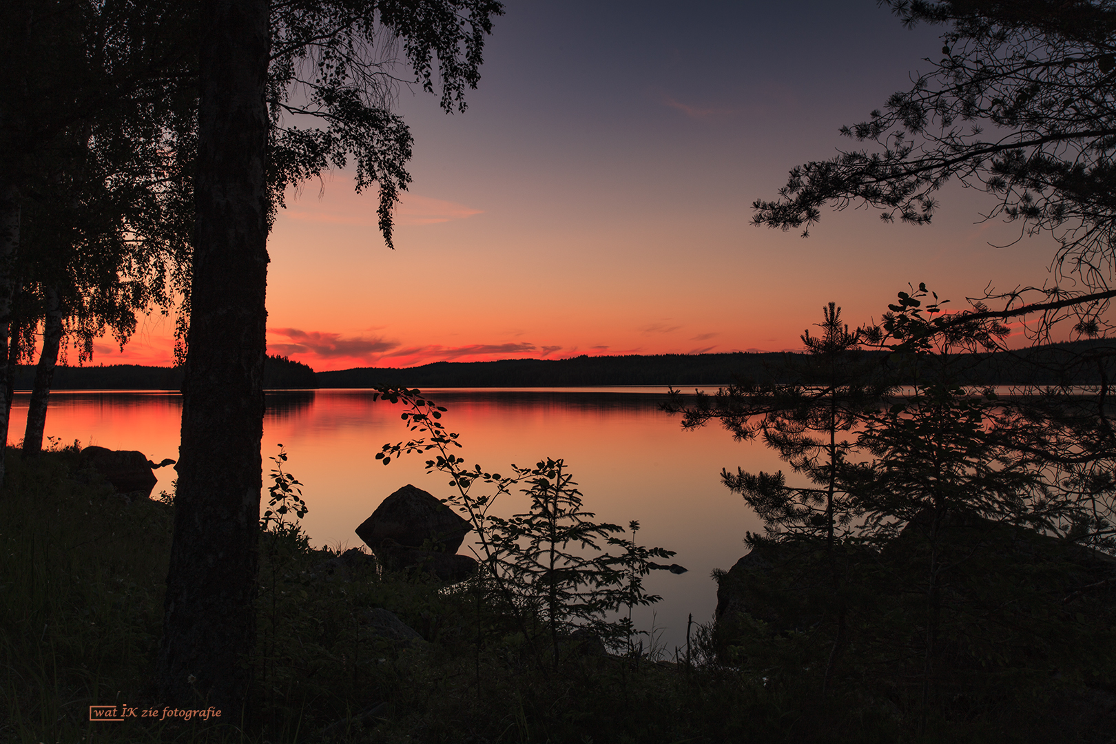 Wat een mooi land, Zweden, talloze meren met mooi stil water. In juni gaat de zon niet helemaal onder, waardoor je bijna 24 uur per dag kunt fotograferen. Aan de rand van een meer, de zonsondergang vastleggen met prachtige kleuren!!
