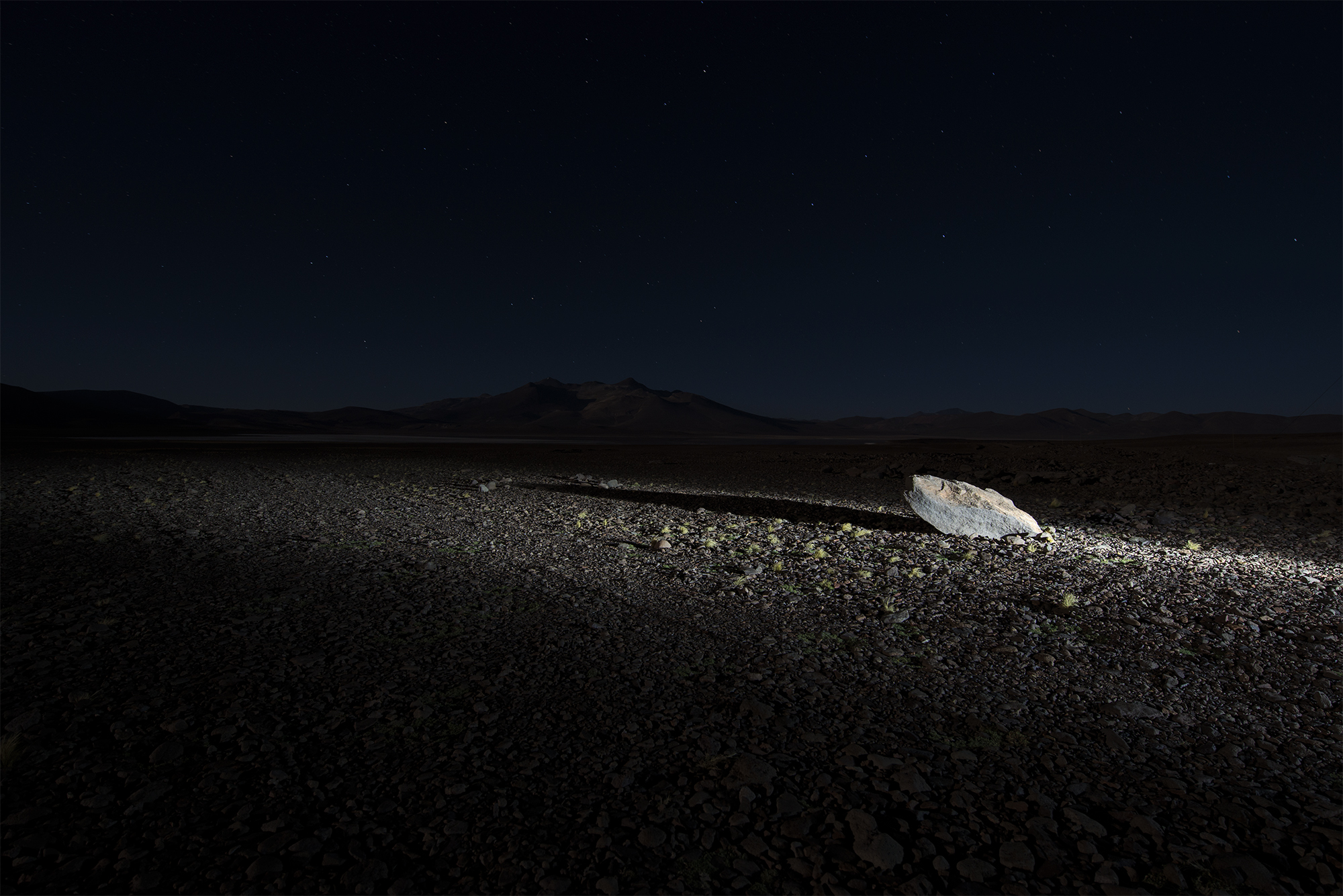 Overnachten op 4200m in de nacht als de temperatuur ver onder nul zakt deze foto gemaakt in het adembenemend lege National park Tres Cruses in het Noorden van Chili. Op de achtergrond zijn in de duisternis nog net de contouren van de bergen te zien.
