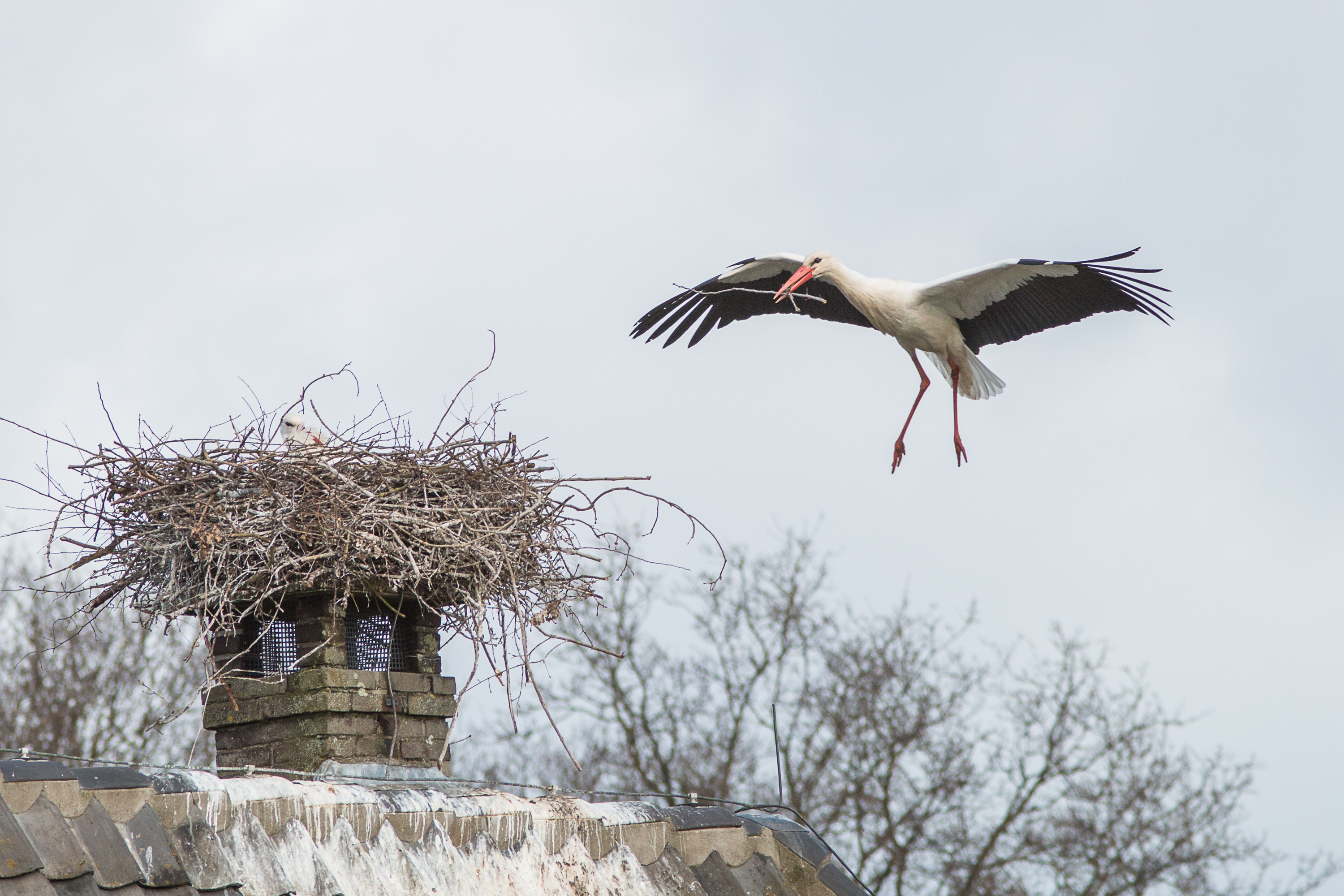 Ooievaars zijn bezig met hun nest