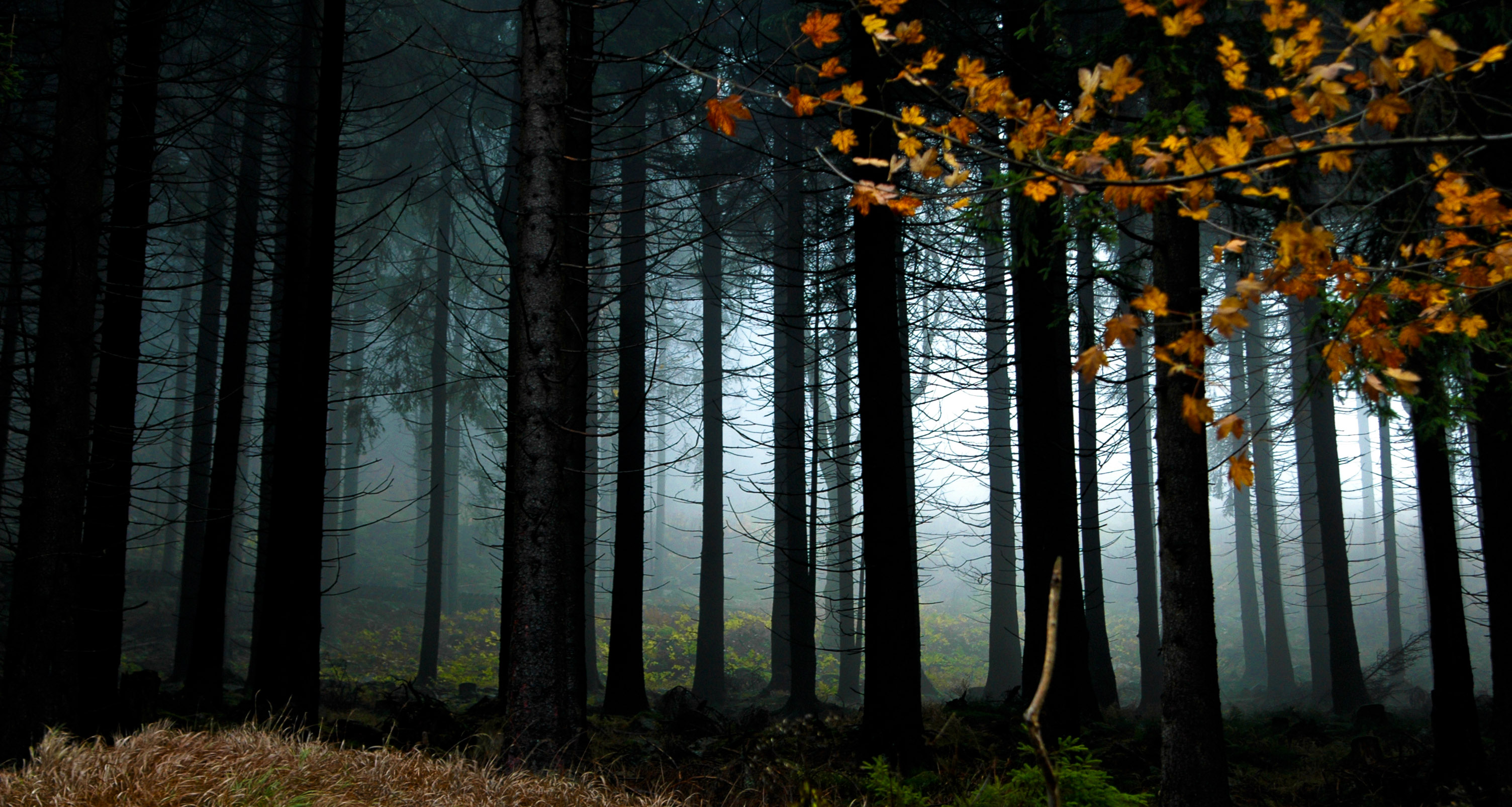 Dit is het uitzicht op de berg die in Duitsland ook wel de heksenberg wordt genoemd, gek genoeg weet ik de echte naam niet meer. De berg heet in elk geval zo omdat er vrijwel altijd een dichte mist rond de top hangt, dat was nu ook zo. Het zicht was zeer beperkt. Maar iets lager op de berg leverde dat prachtige plaatjes op. Het was winter, maar de laatste gele blaadjes hingen nog aan één boom.
