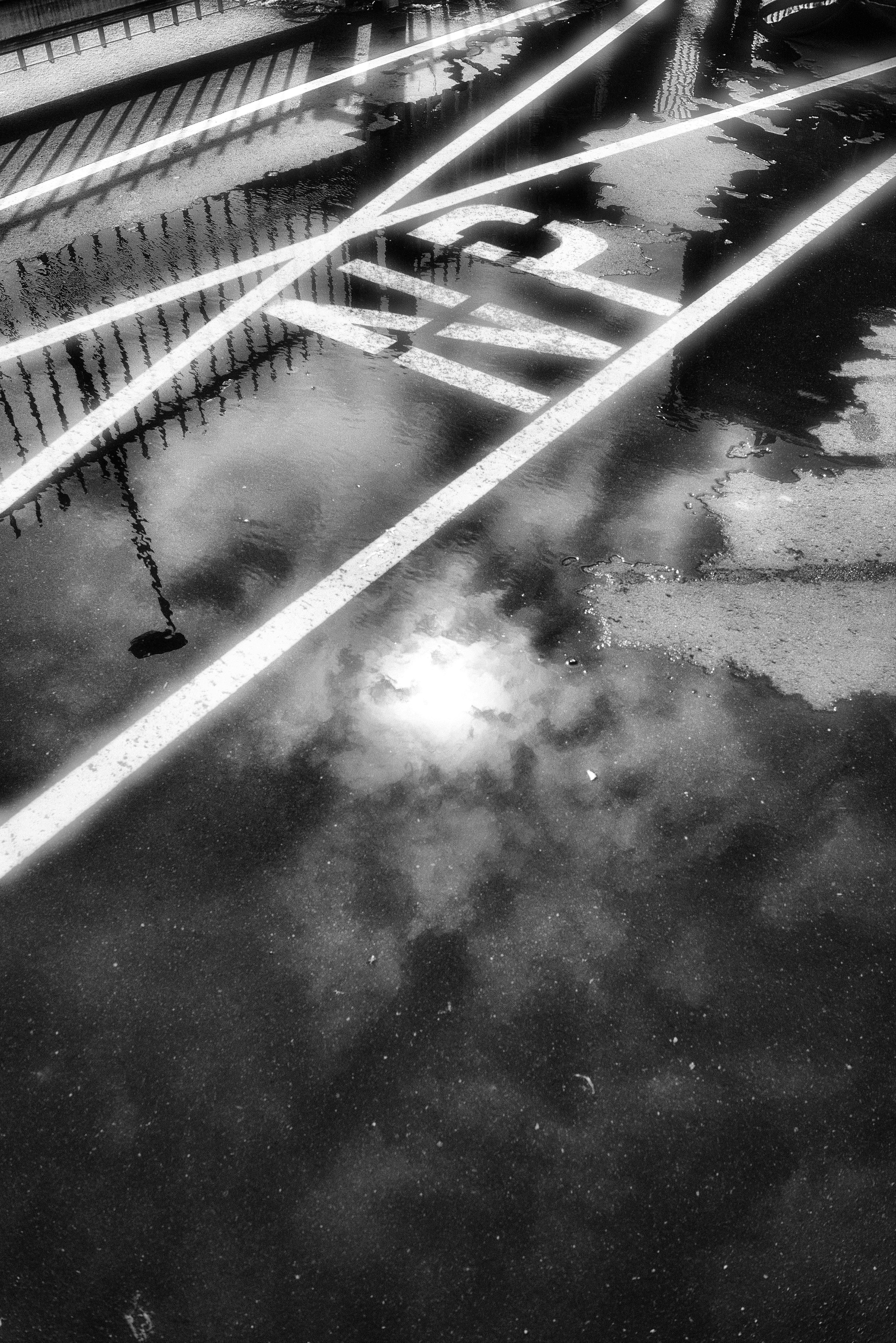 De zon weerkaatst in het water op de parkeerplaats.