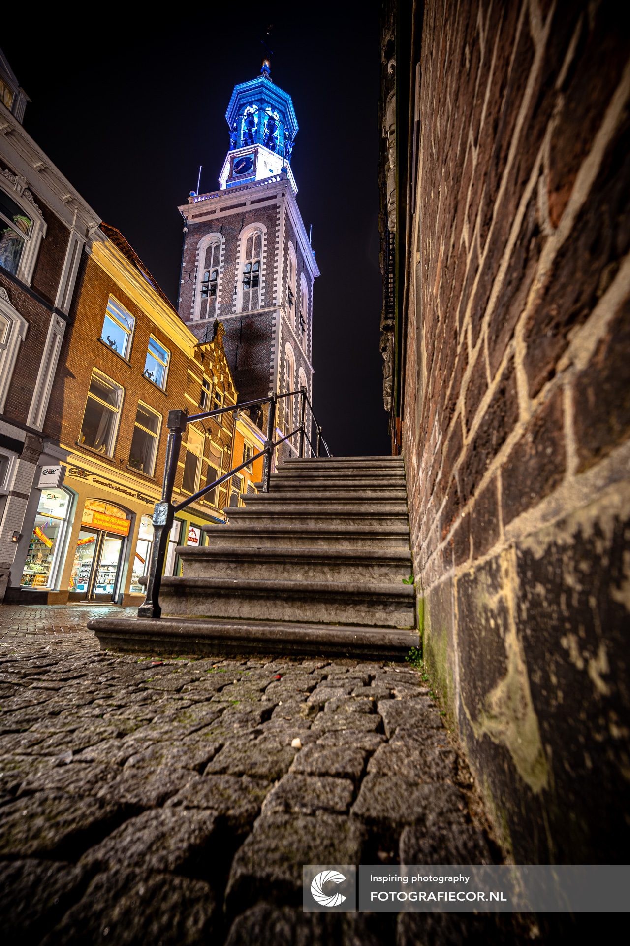 Vanuit een onmogelijke hoek en in een bizare houding gevouwen lukte het me het lijnenspel samen te laten komen. Het resultaat van een avondje zoeken naar nieuwe perspectieven in mijn eigen stad