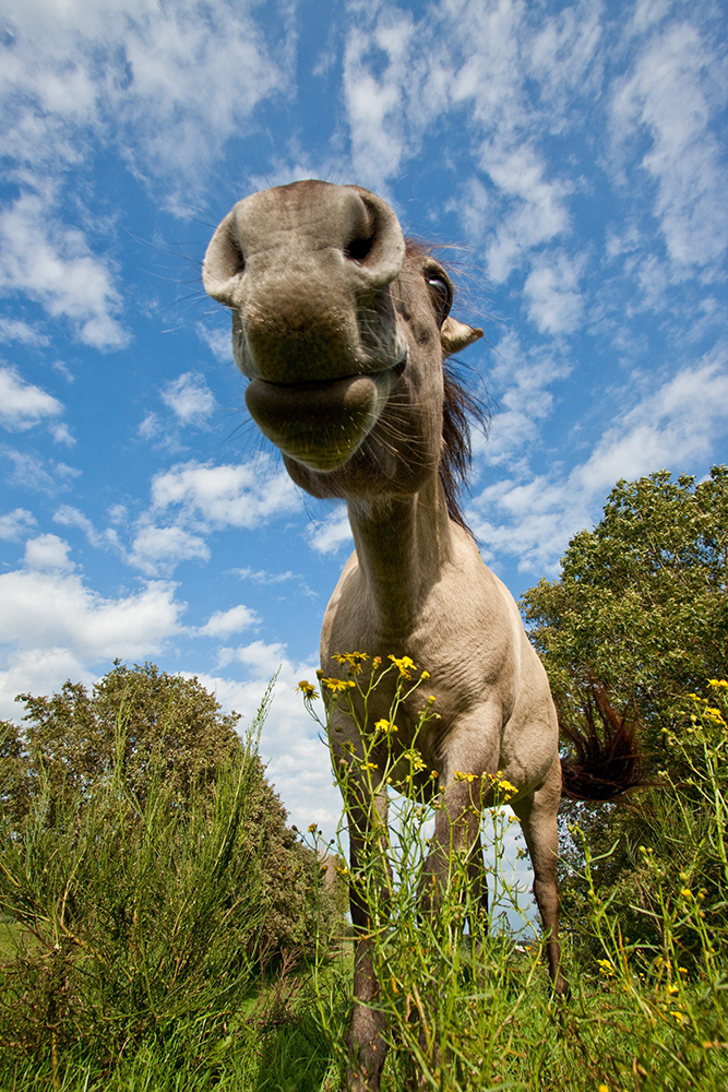 Tijdens het fotograferen van een paddenstoel kwam deze nieuwsgierige pony even een kijkje nemen. Met de groothoek gaf dat een leuk effect.....