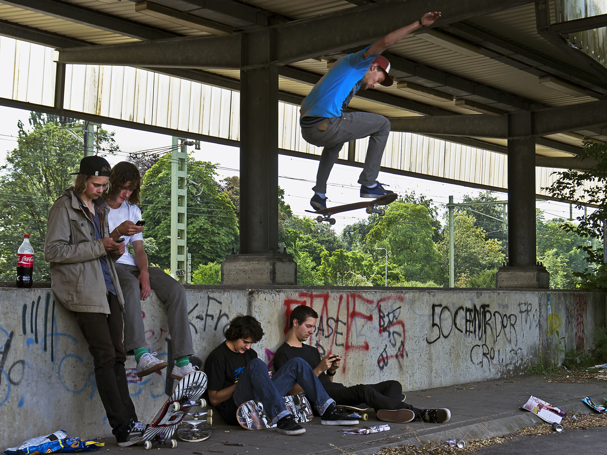 De desinteresse van de jonge skaters in de sprong van hun vriend spreekt boekdelen.