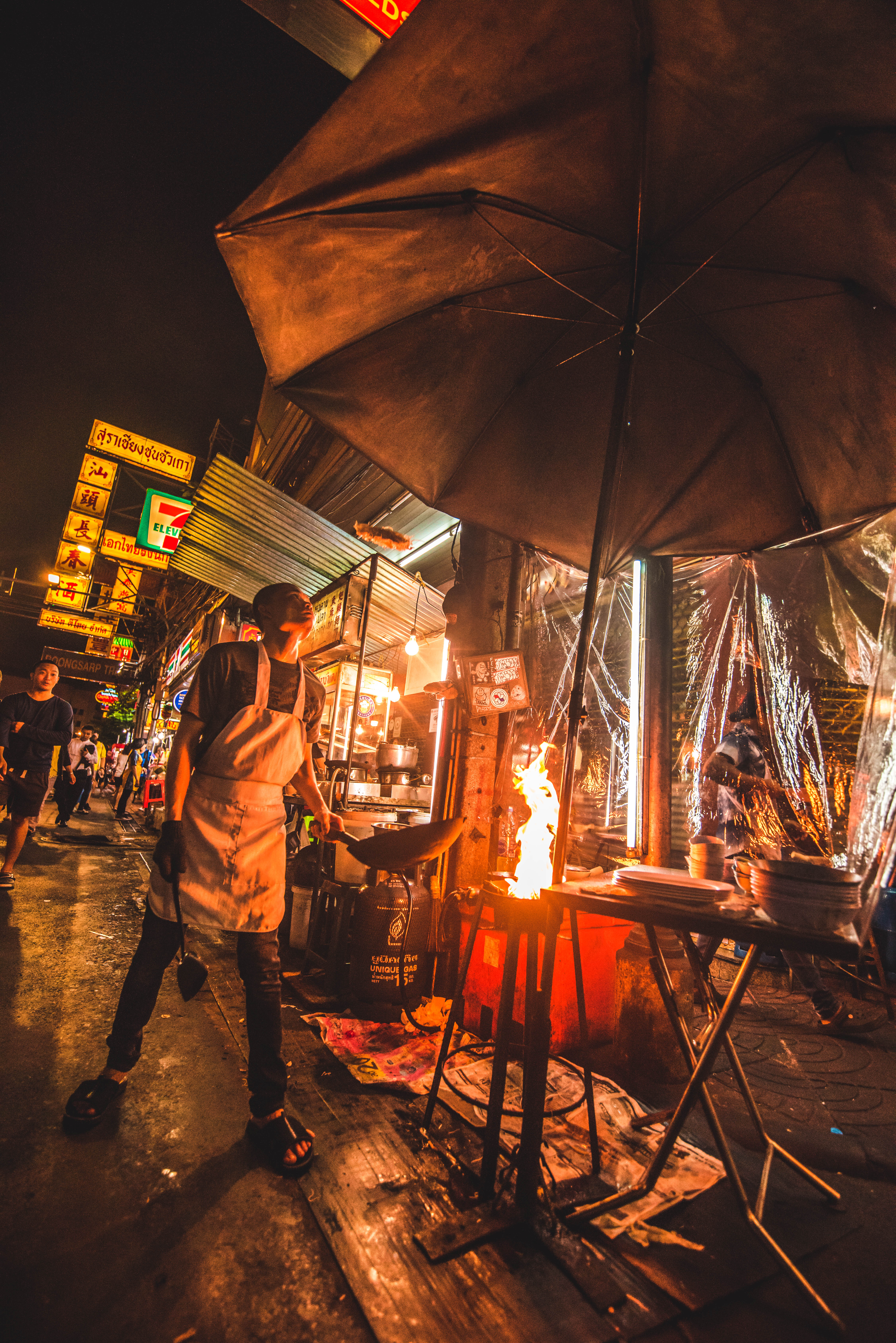 Laat in de avond, wierp ik een blik op deze noodles kok op straat in Bangkok. Geschoten met een D810 en de 15-30 f2.8 van Tamron. iso op 3200 en op 15 mm 1/500ste