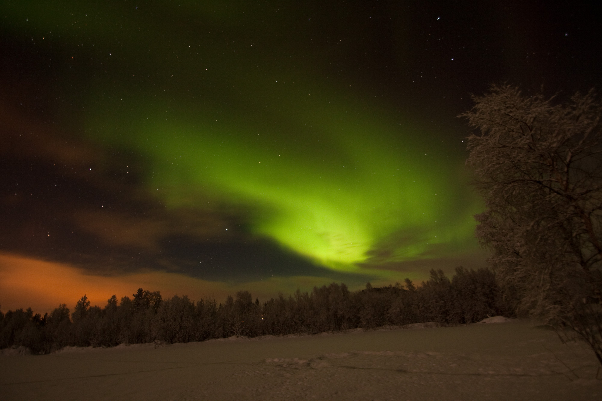 Een warm gevoel bij -22 graden C en van 21.30 tot 22.33 uur wachten aan de rand van een besneeuwde weide, een keer per kwartier een auto die voorbijkomt. Noorderlicht geeft een euforisch gevoel en op de foto is het die herinnering die telkens weer boven komt