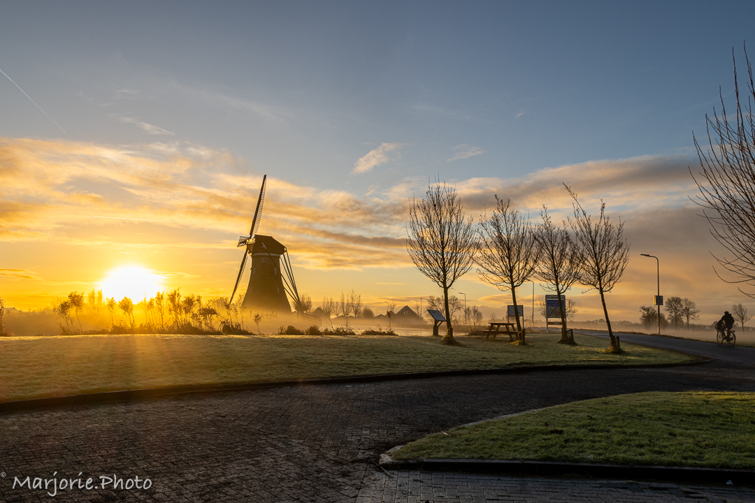 Oudjaarsdag. Vorst op het land. De zon komt op bij de molen van Haastrecht. Het is glad en het is koud. Maar de fietser laat zich niet tegenhouden en beweegt langzaam vooruit het beeld in.