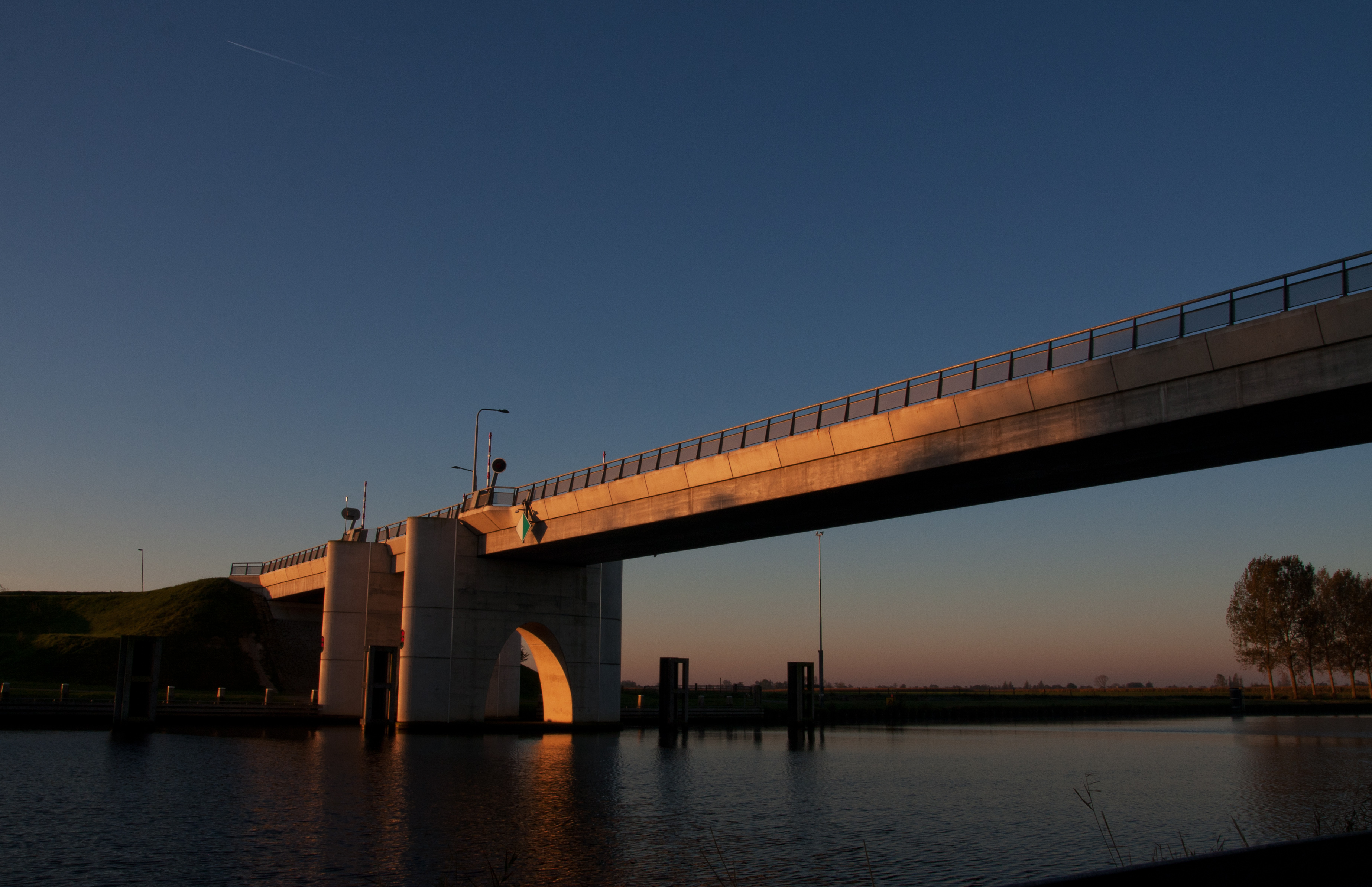 Als de zon 's morgensvroeg opkomt dan verlicht hij met een mooi warm licht deze moderne brug.