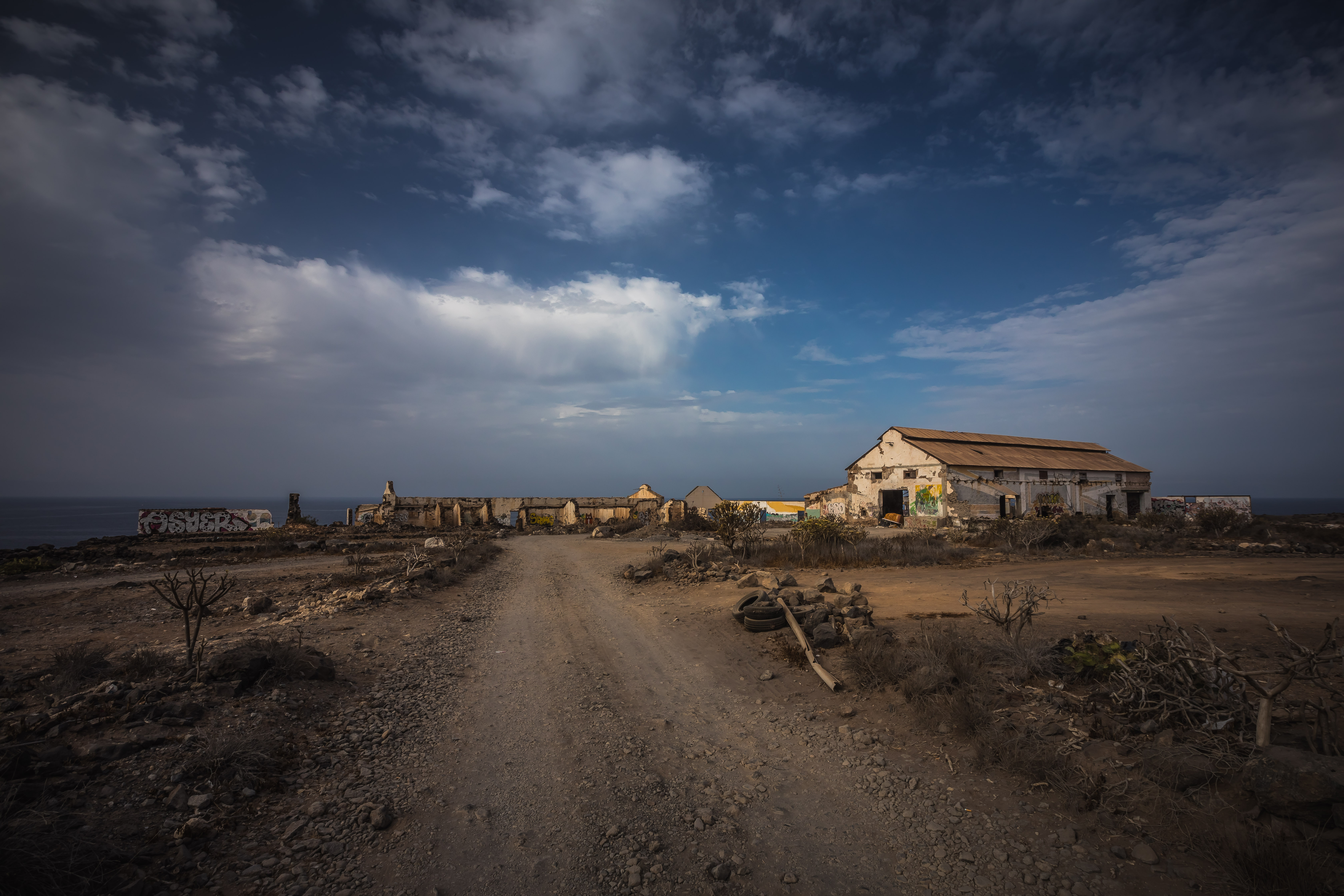 Toerend over de binnenwegen van Tenerife, kwamen we deze verlaten gebouwen tegen. Een hele mooie ligging aan de kust, een enorme puinhoop, fraaie graffiti en schitterend licht. Een cadeautje.