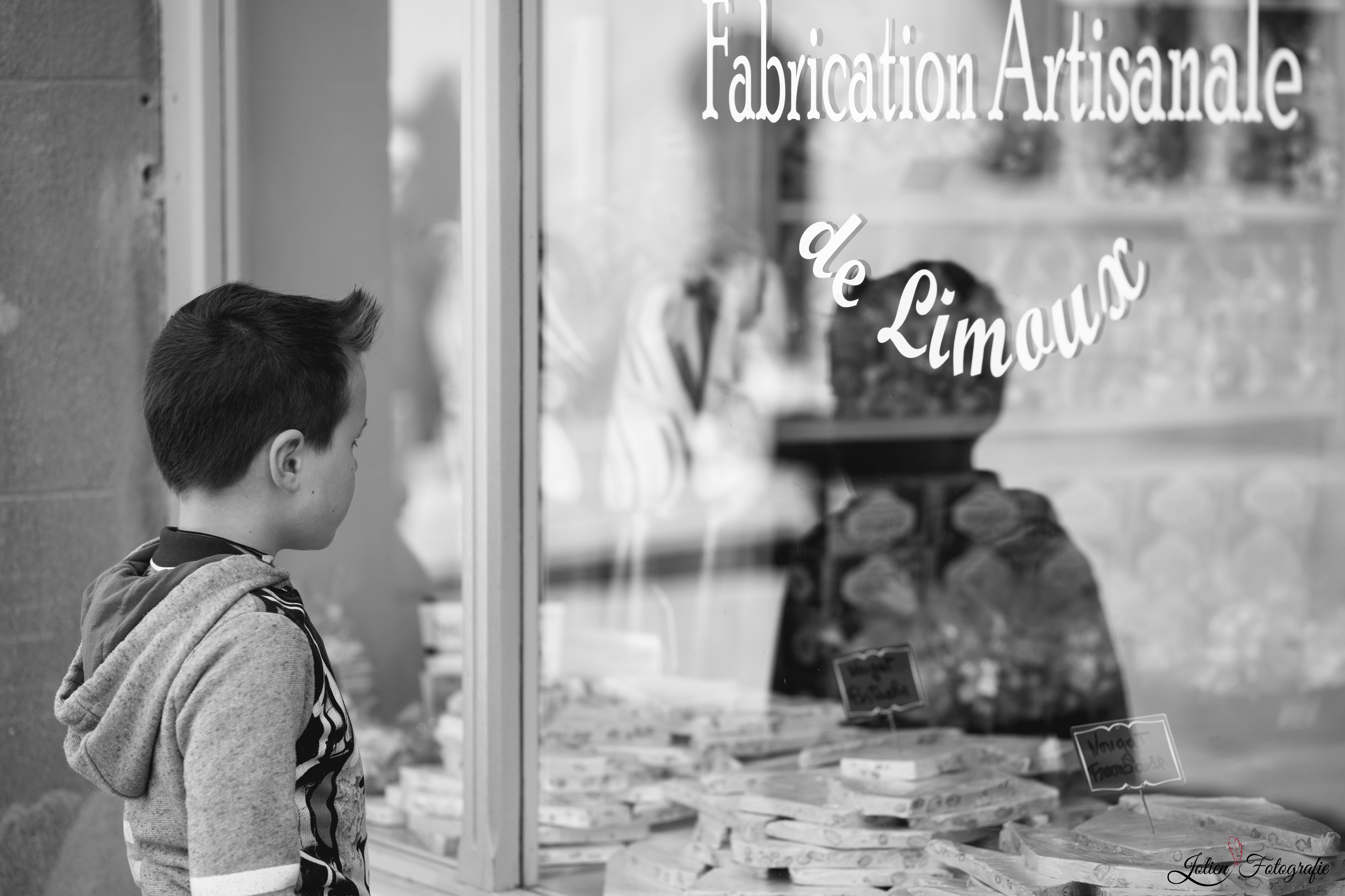 Starende jongen in een etalage van een nougat-winkeltje in Carcassonne, Frankrijk. Het water liep hem in de mond.. En dan die schaduw in het raam maakte voor mij het plaatje compleet..