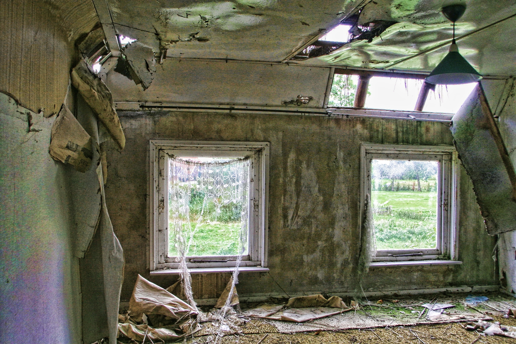 Boven nog een oud slaapkamertje aangetroffen,met lamp er boven,gordijntjes nog voor de ramen en uitzicht over landerijen.