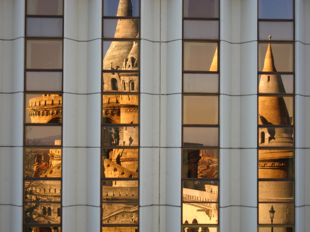 Achterzijde van het Hilton te Budapest. In de reflectie het oude Kasteel.